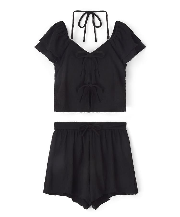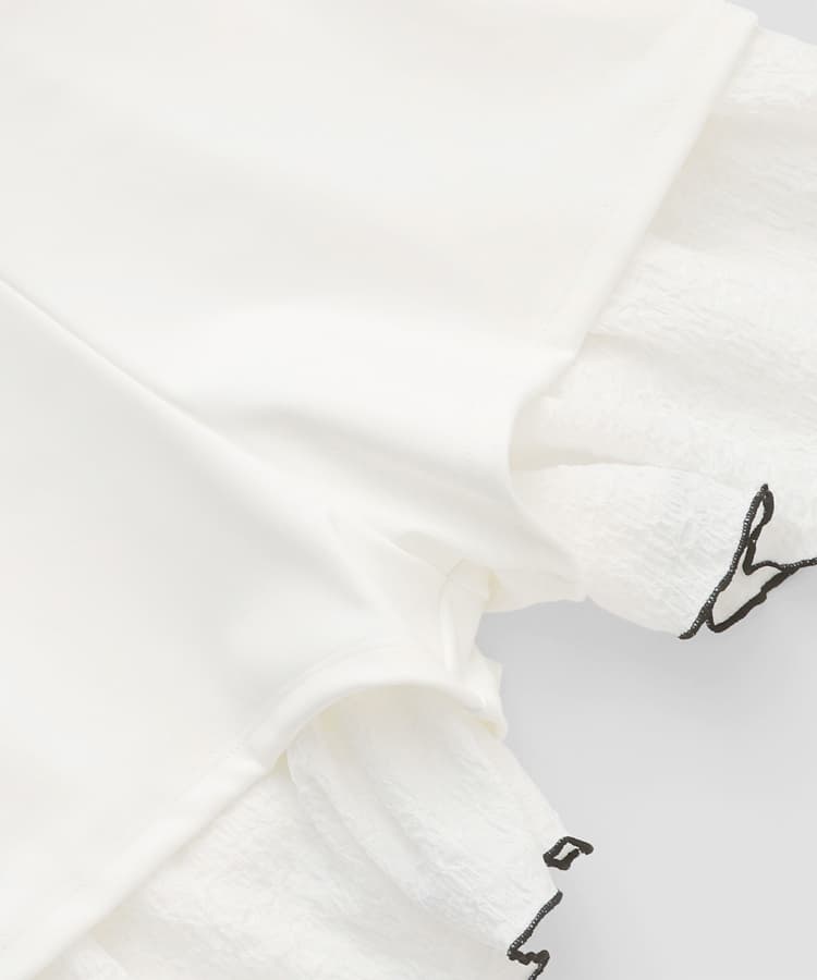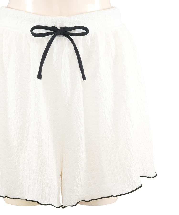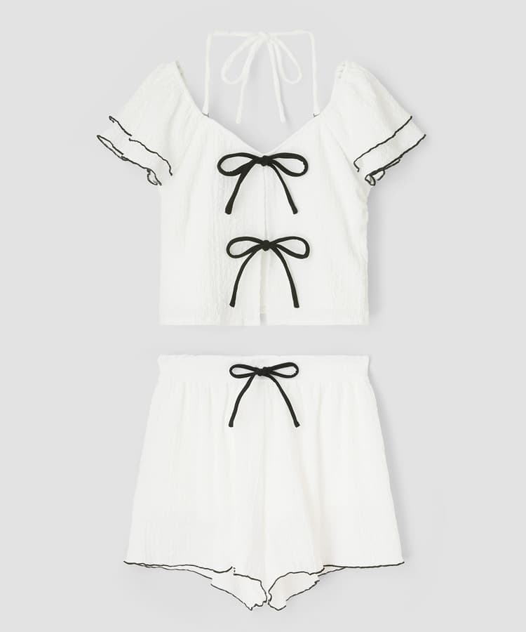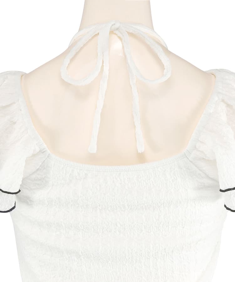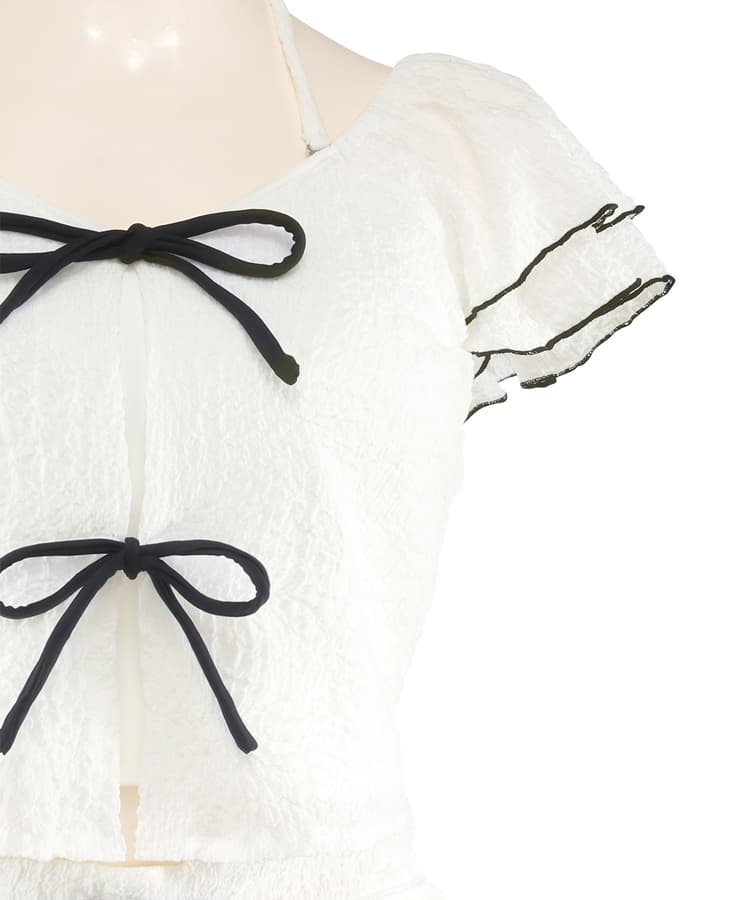 ポップコーン素材を使用、フロントリボンがポイントのトップスはデニムと合わせても◎