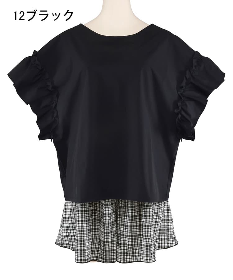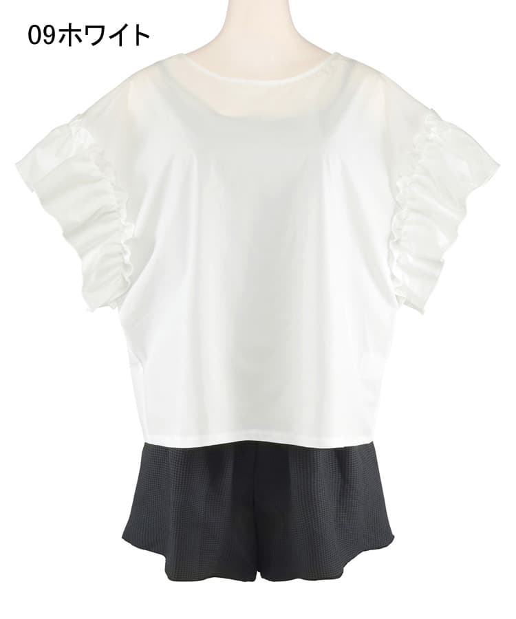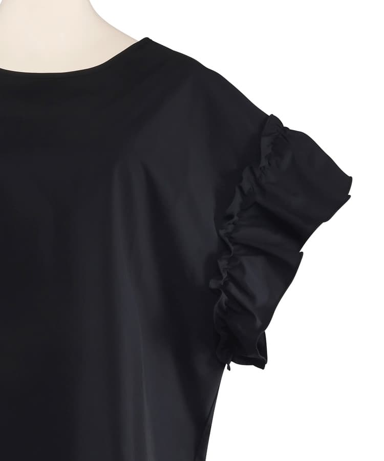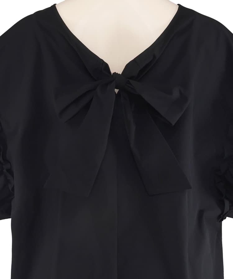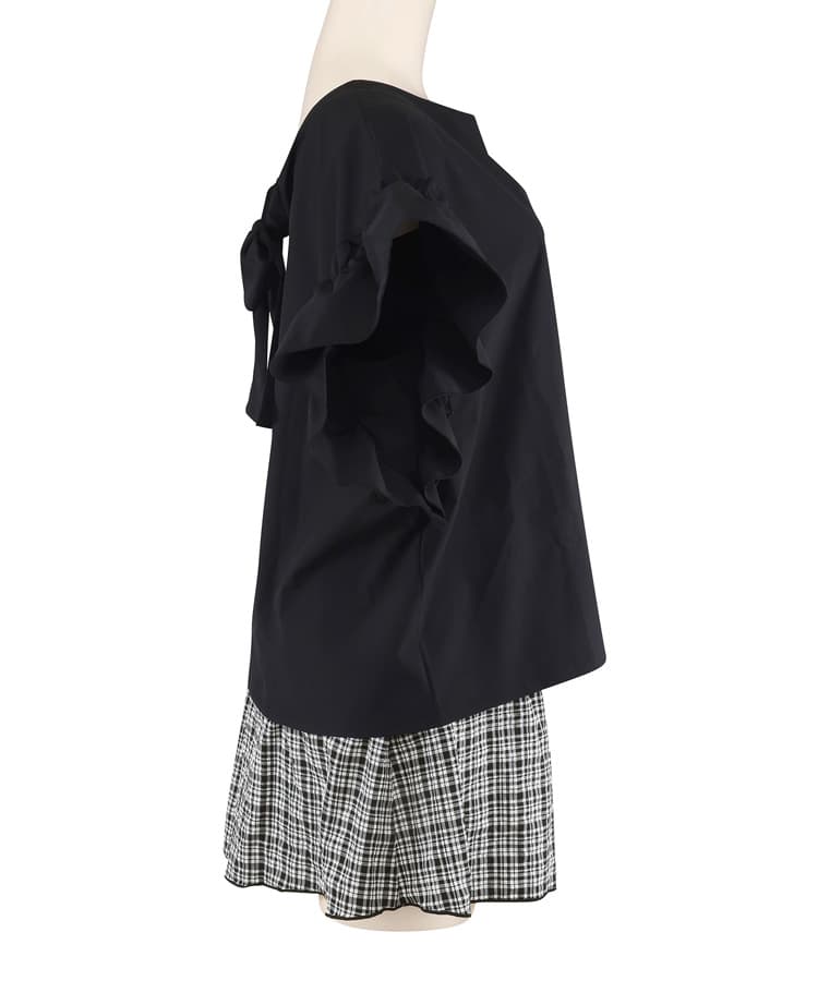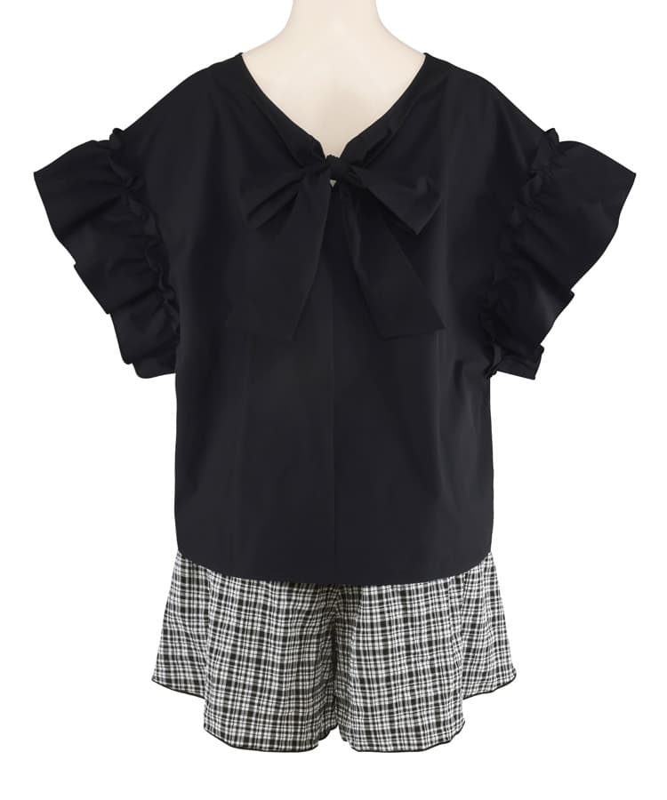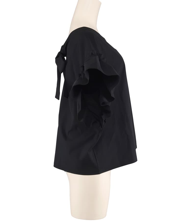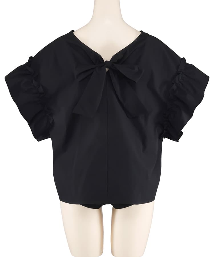 肩のギャザーフリルや首元のリボンがポイントのフェミニンなラッシュトップスに
