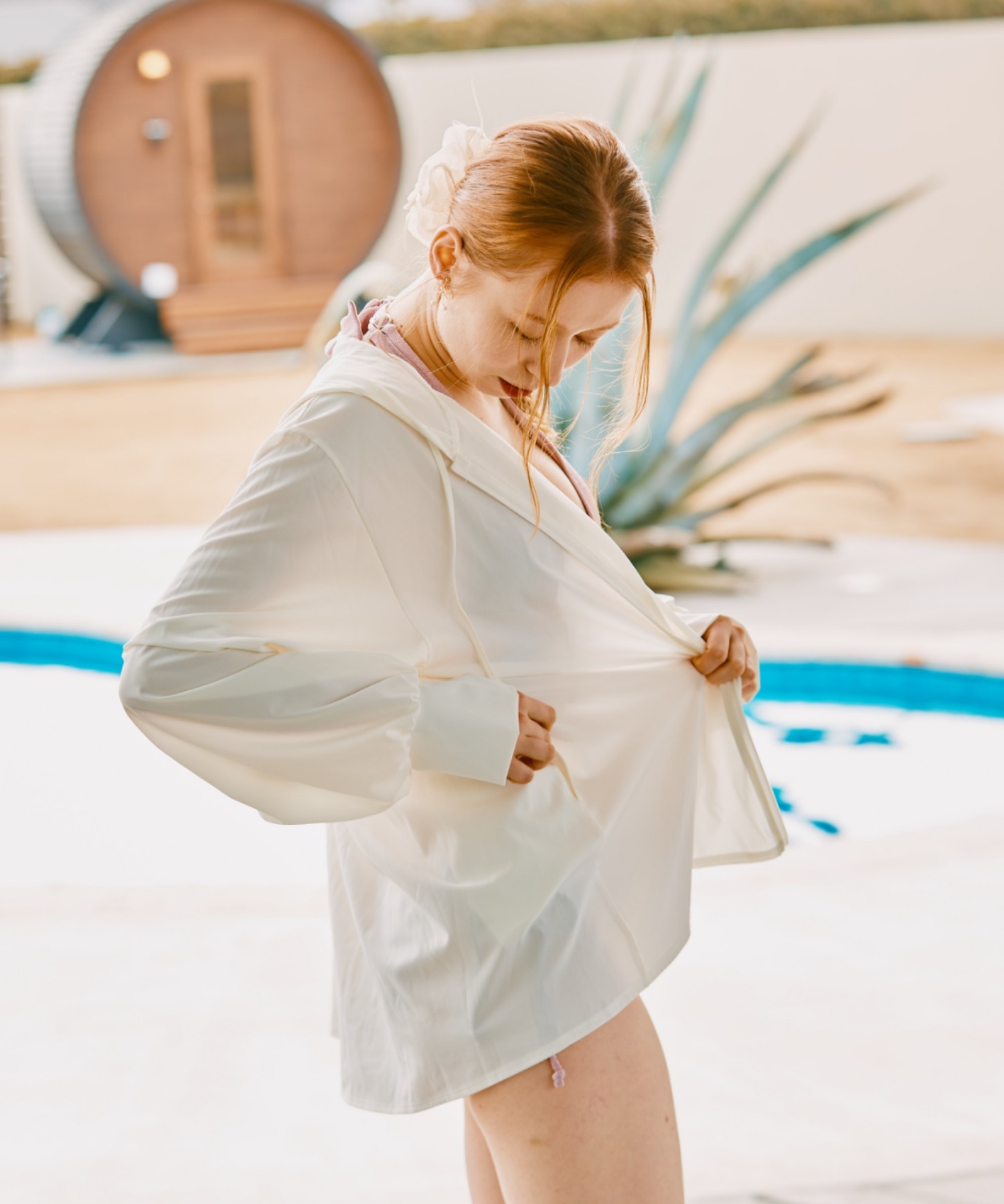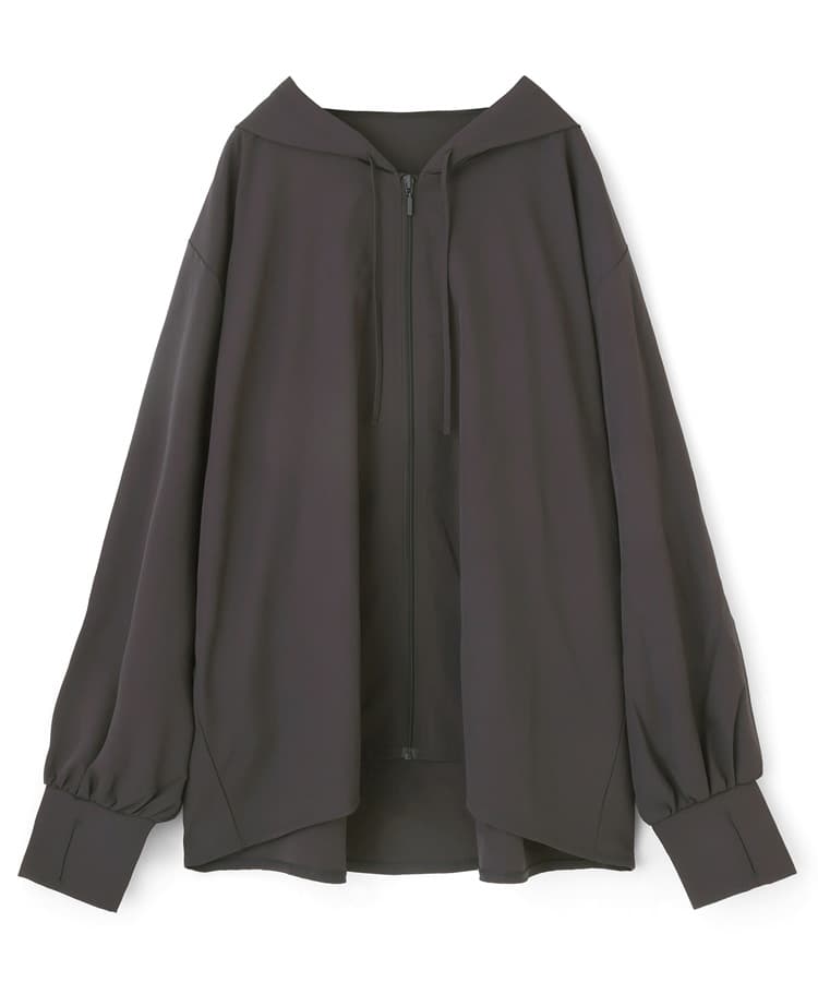 後ろ下がりのロング丈ラッシュパーカーは気になるヒップと太ももをさりげなくカバー。