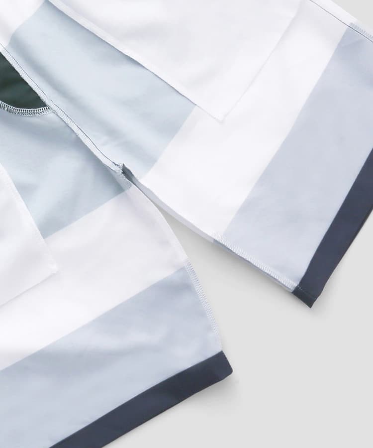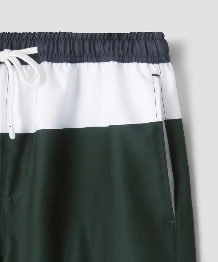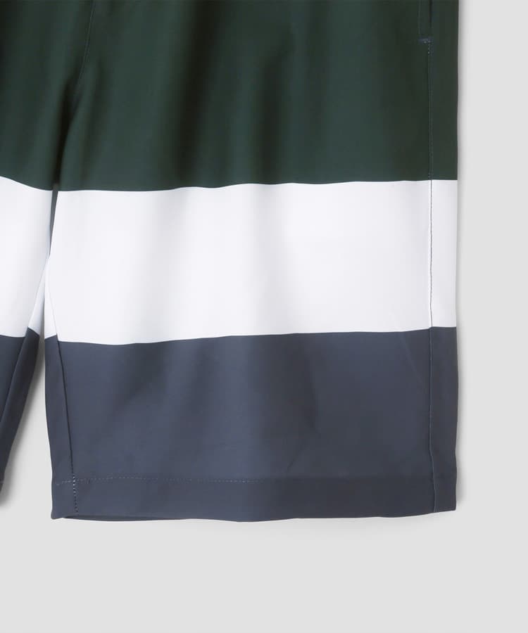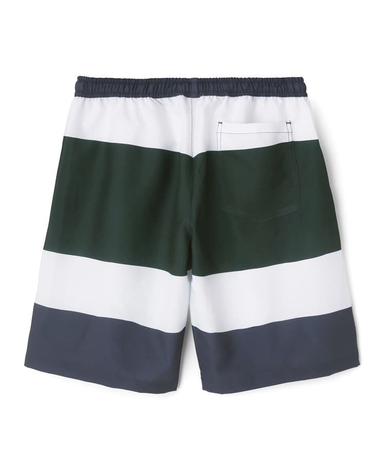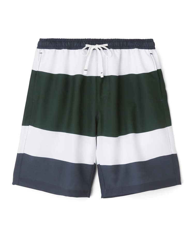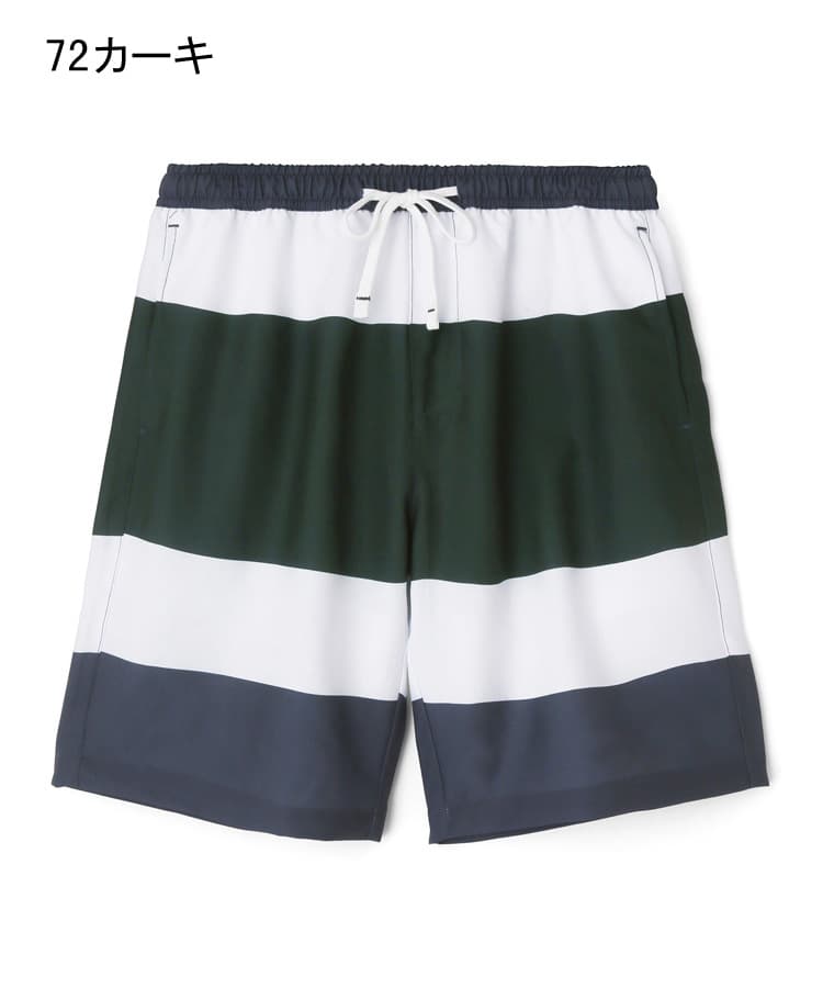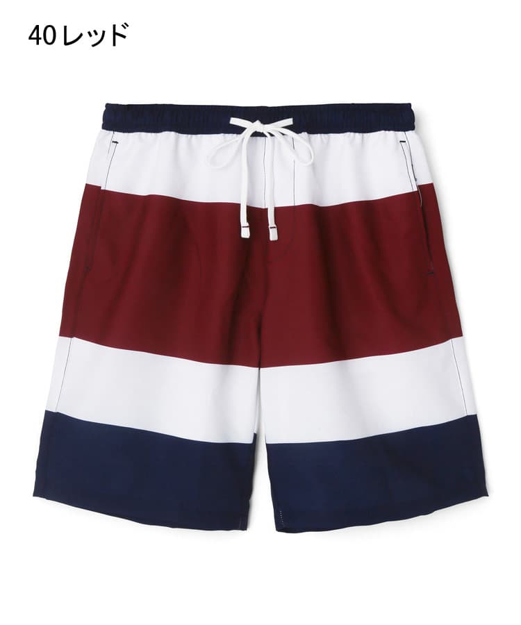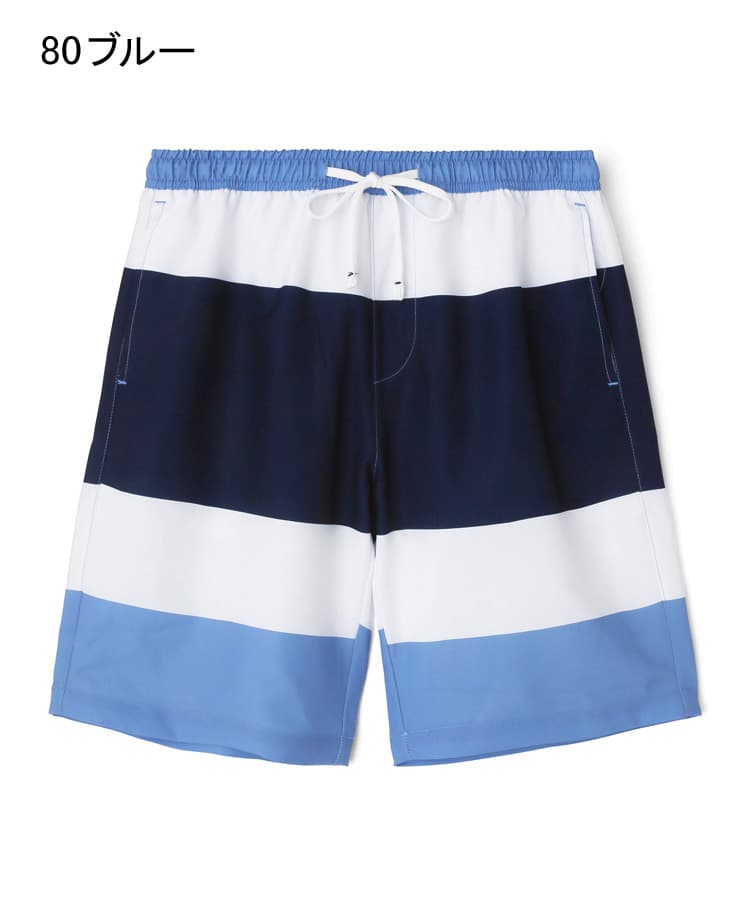 メンズの柄で定番の太ボーダープリントは、明るめの配色がビーチやプールサイドで映えるポップな水着です。