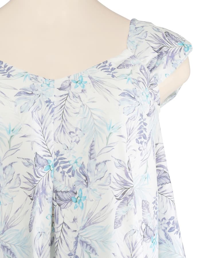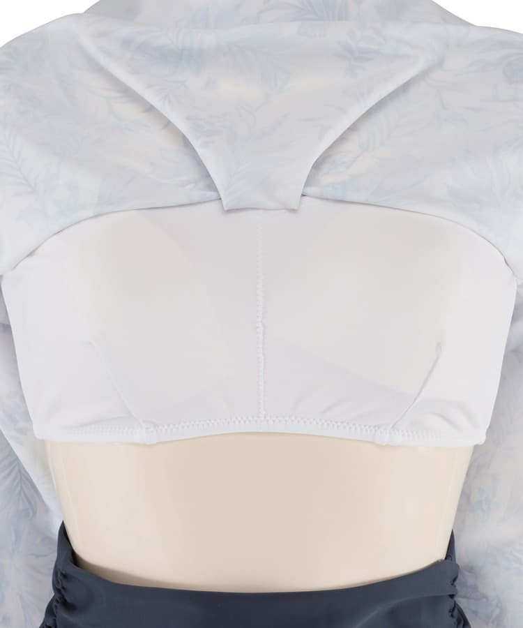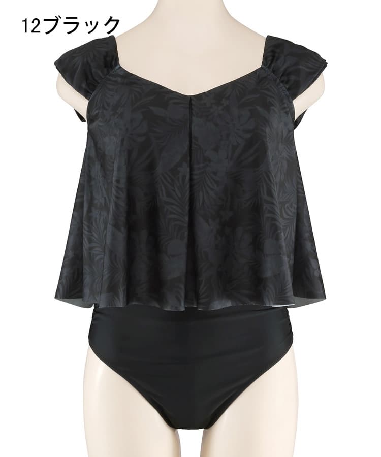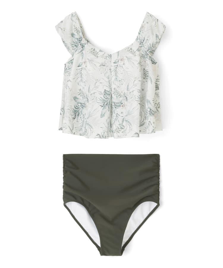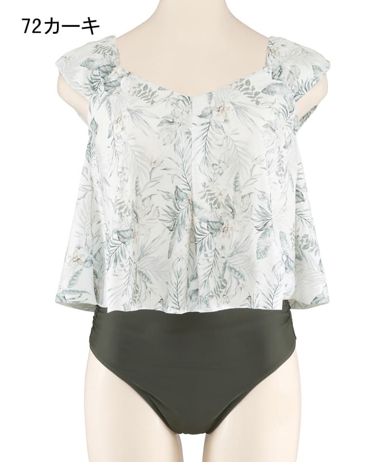 大人っぽい落ち着いたリーフプリントがポイントのワンピース風のセパレート水着。