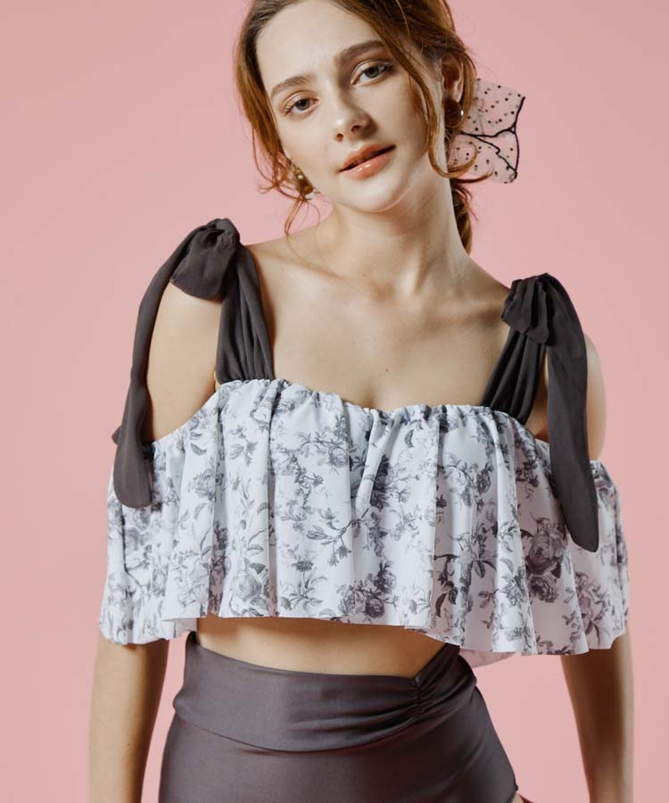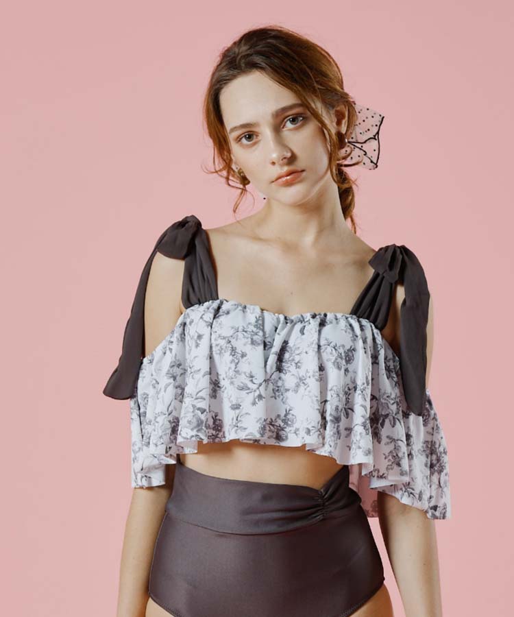 壁紙風の繊細なフラワープリントのオフショルダーワイヤービキニ。