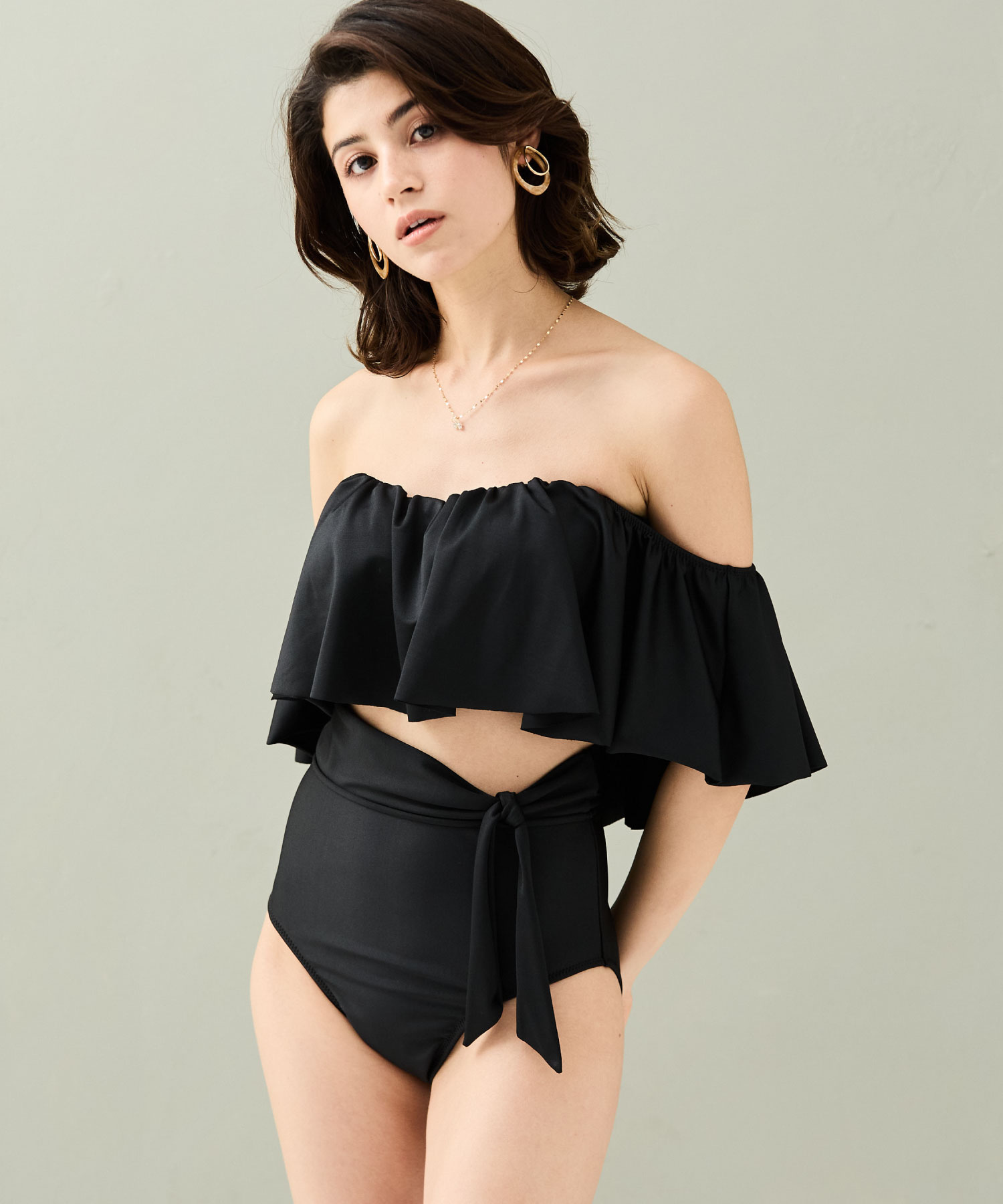 ほどよいボリュームのフリルが印象的なオフショルダーブラと、すっきり見えるハイウエストショーツでメリハリのあるシルエットのビキニです。