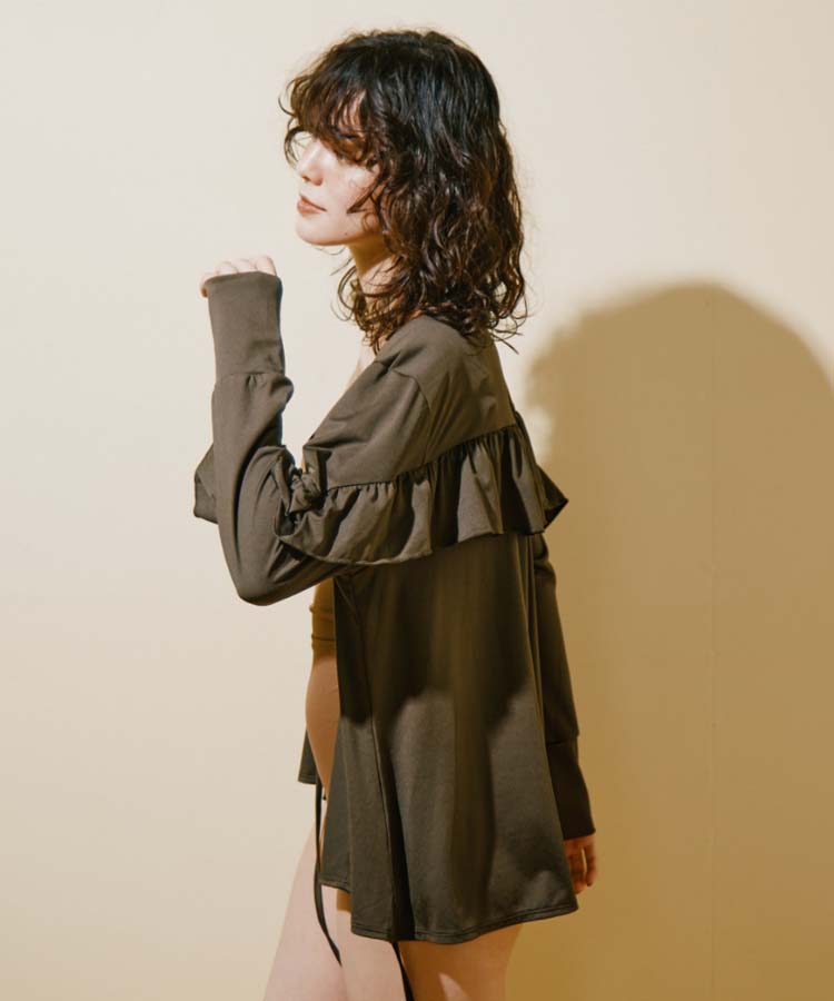 背中から袖に繋がったフリルデザインが大人フェミニンな雰囲気に。