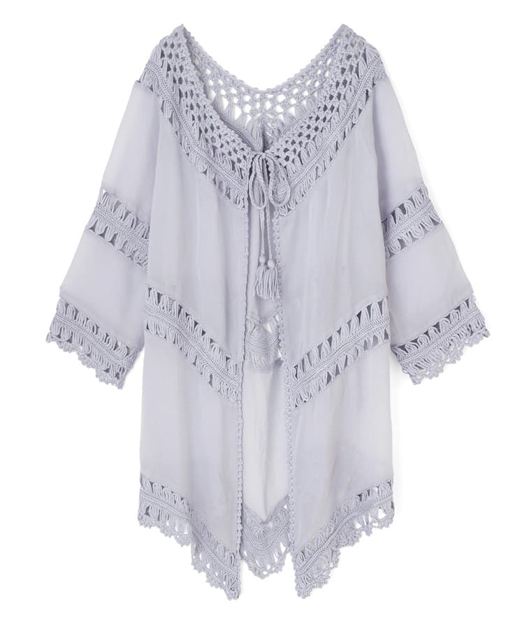 手編みのカギ針が上品な羽織。肩のラインを少しおとして、ゆったりと着用するのが女性らしさアップでオススメ!