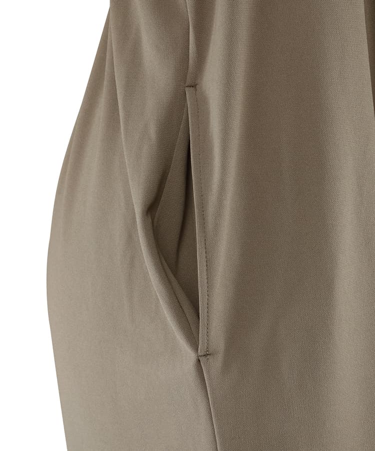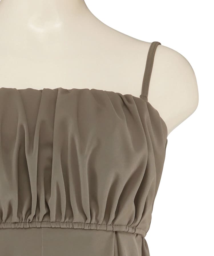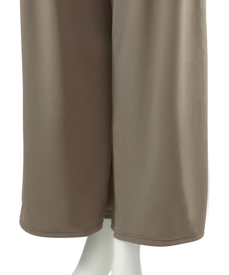 胸元のギャザーが女性らしい雰囲気に。パンツ部分はタックの程よいボリューム感、メリハリのあるシルエットにこだわりました。