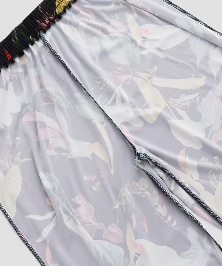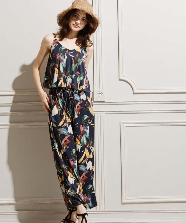 ビーチに映える大胆なボタニカル柄のタンキニとロングパンツのセットアップ。