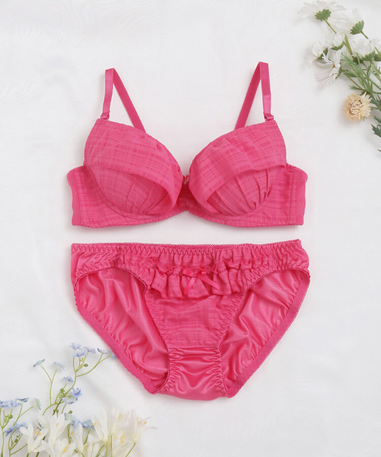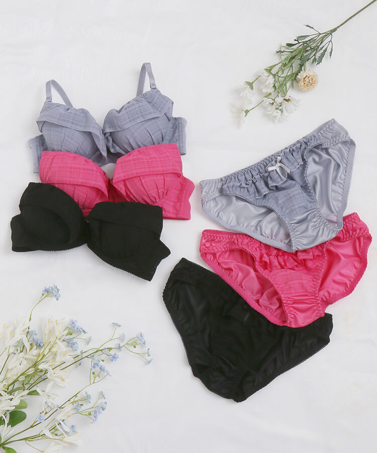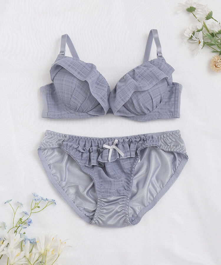 王道フリルがフェミニンでかわいいブラジャー&ショーツのセット。