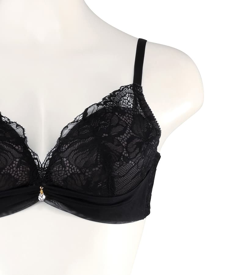 透け感の有るレース、レースと同色のチュールドレープに中心のチャームがポイントです。