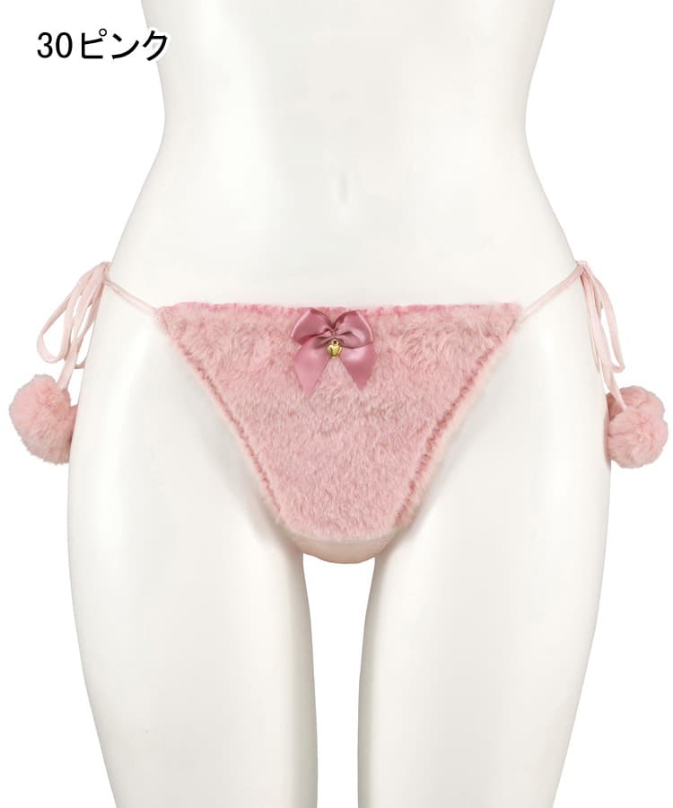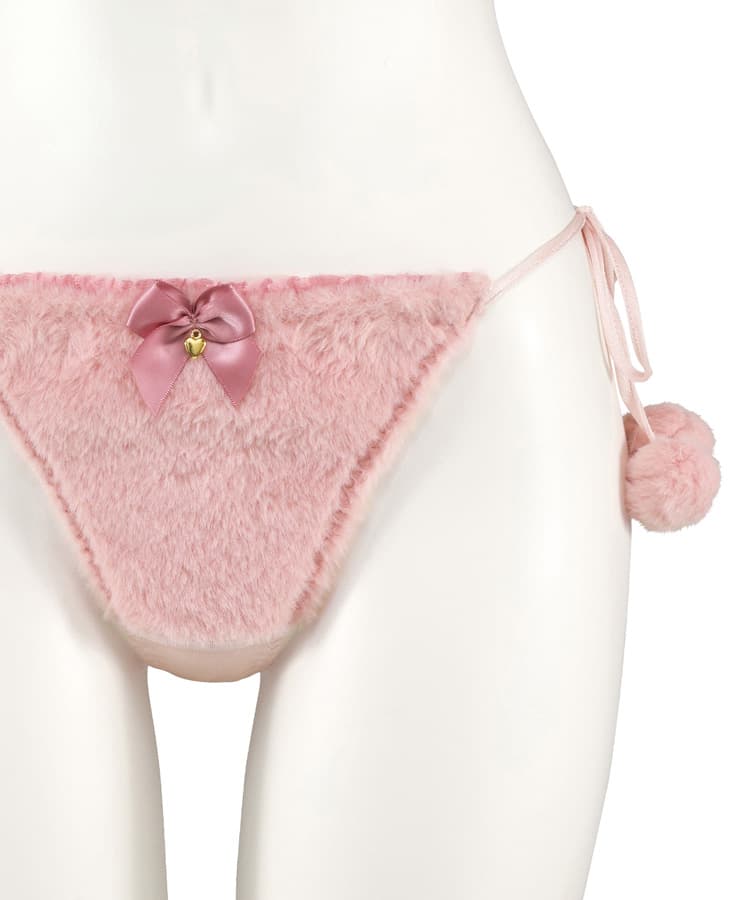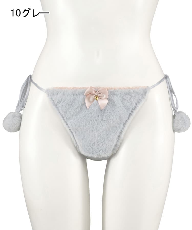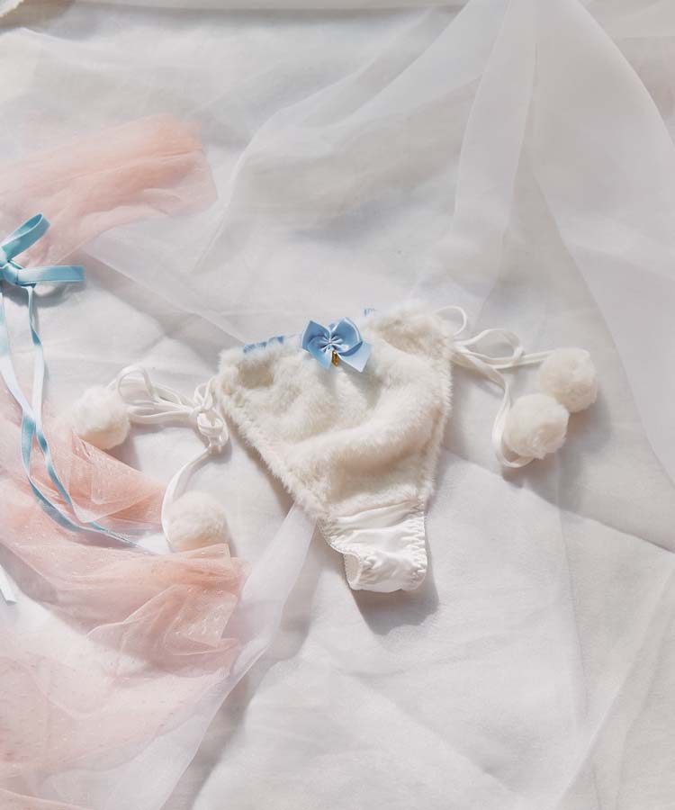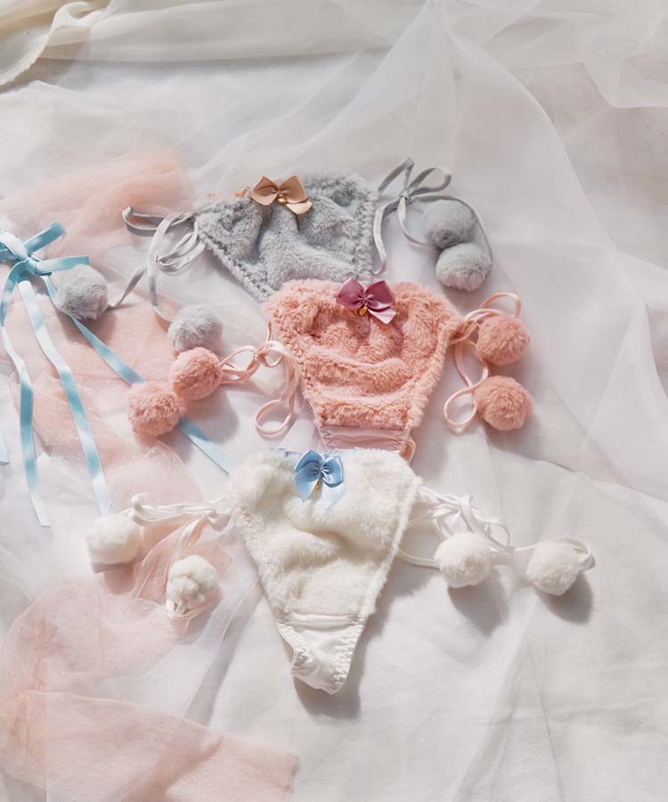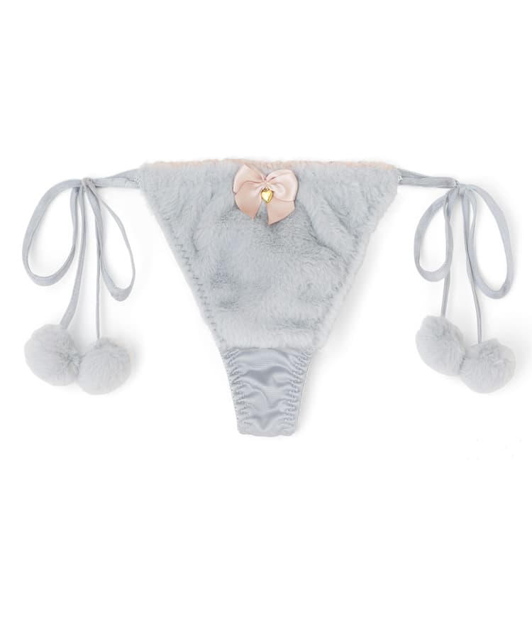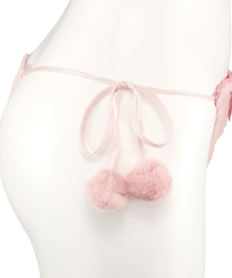 ふわふわのファー素材で仕立てた、ウサギの耳付きブラ&ショーツセットのお揃いTバック。