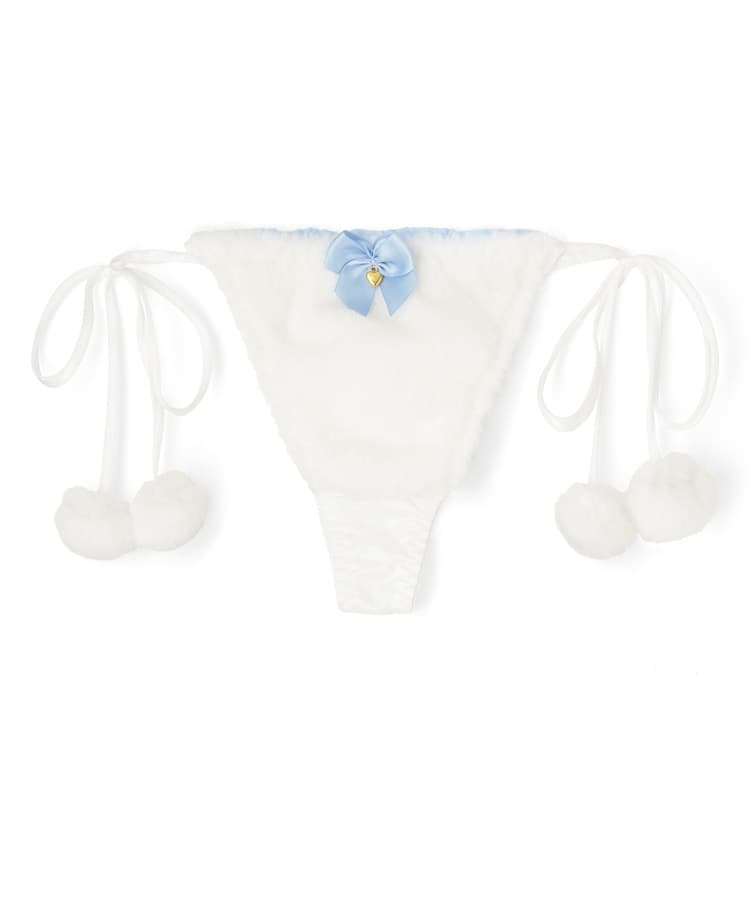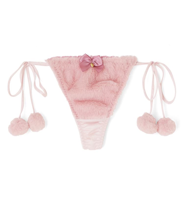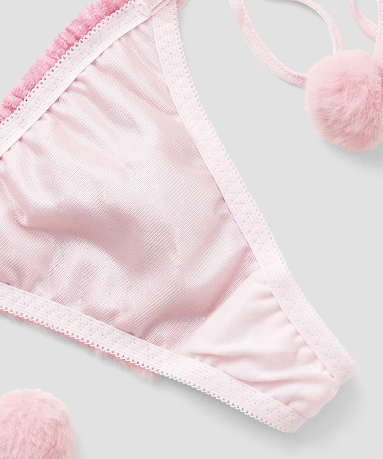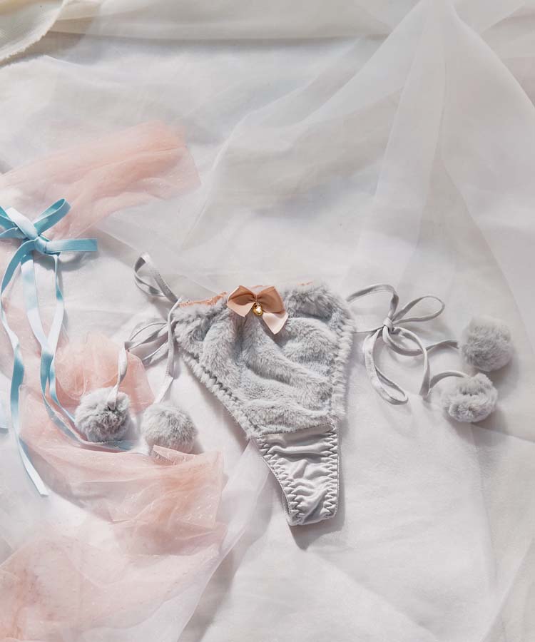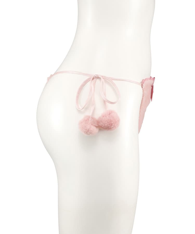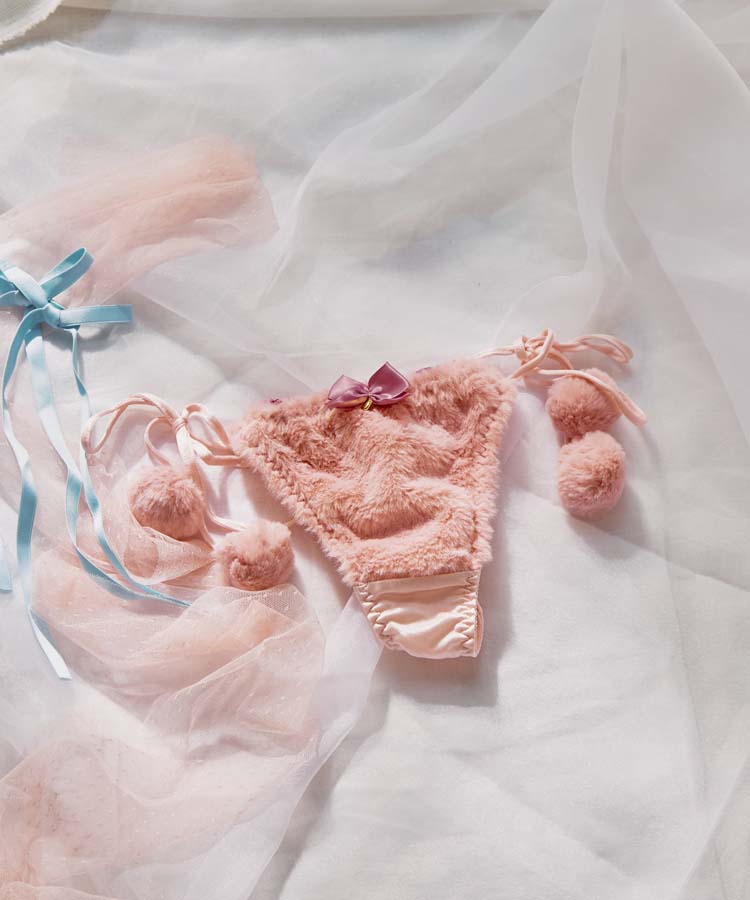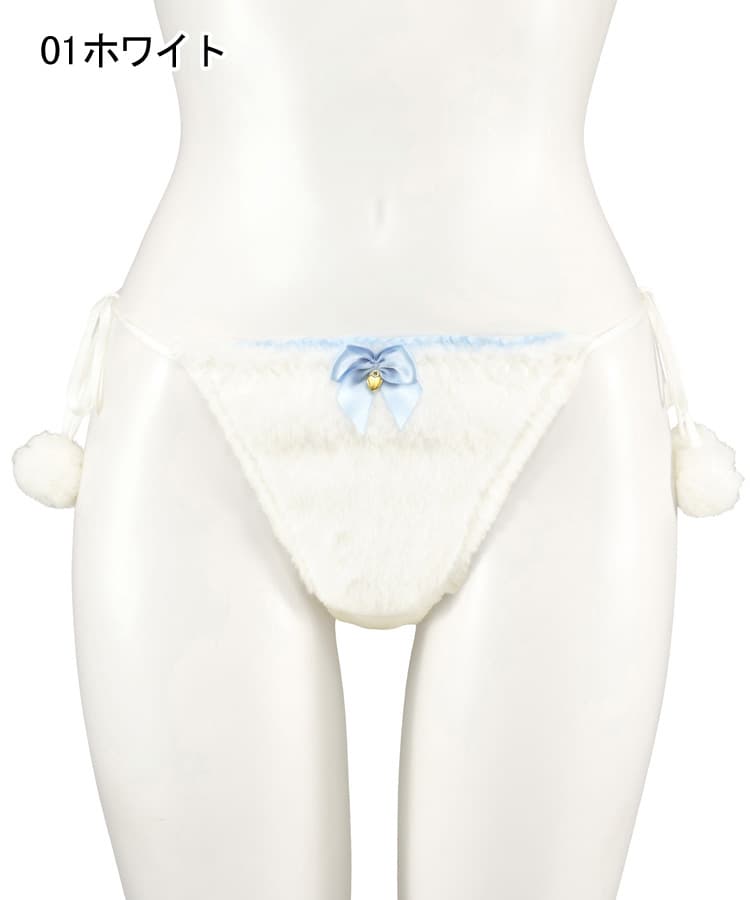 ふわふわのファー素材で仕立てた、ウサギの耳付きブラ&ショーツセットのお揃いTバック。