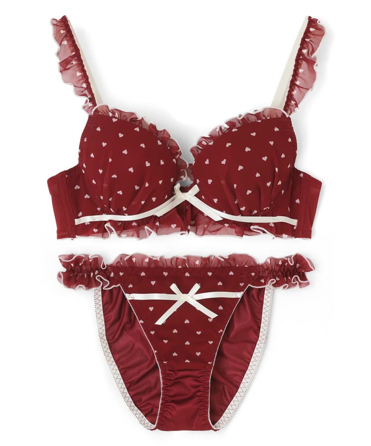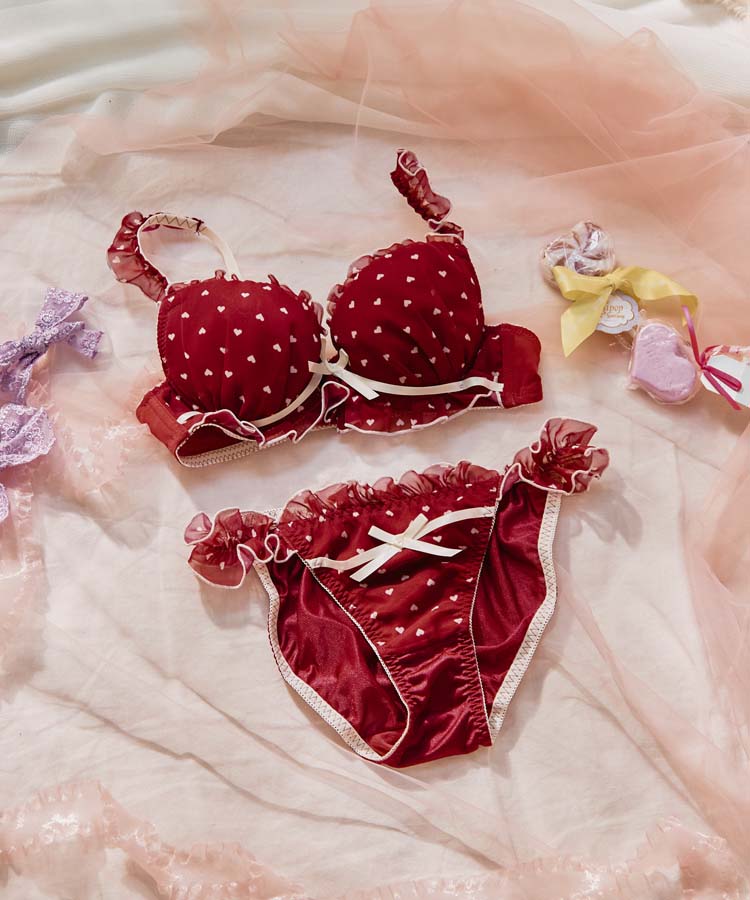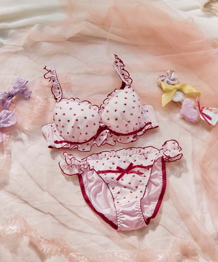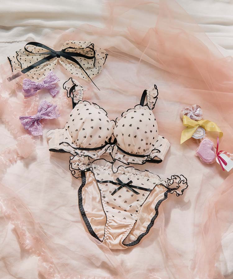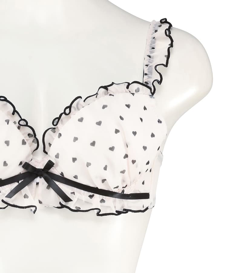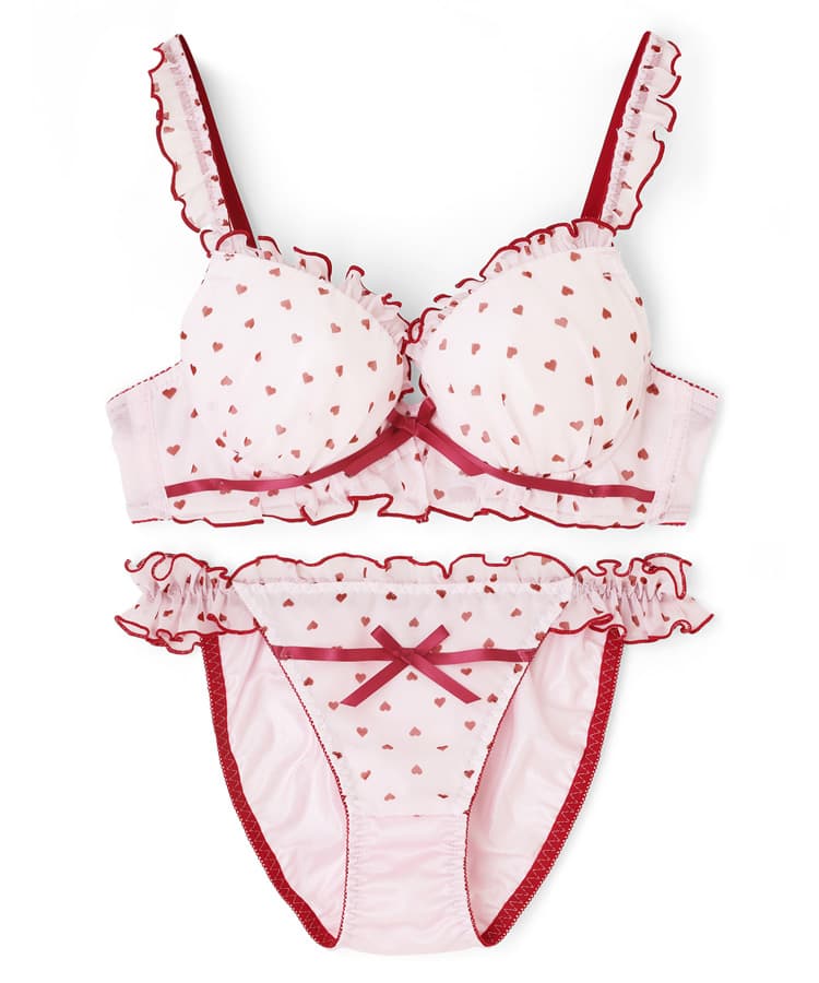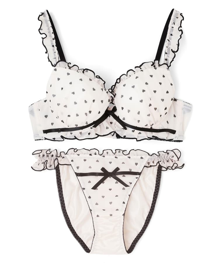ふんわりシフォンに散りばめられた小さなハート柄がとびきりキュートなブラジャー&ショーツセット。