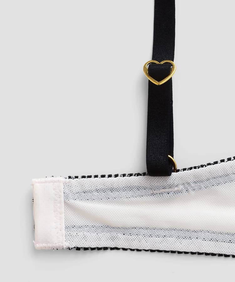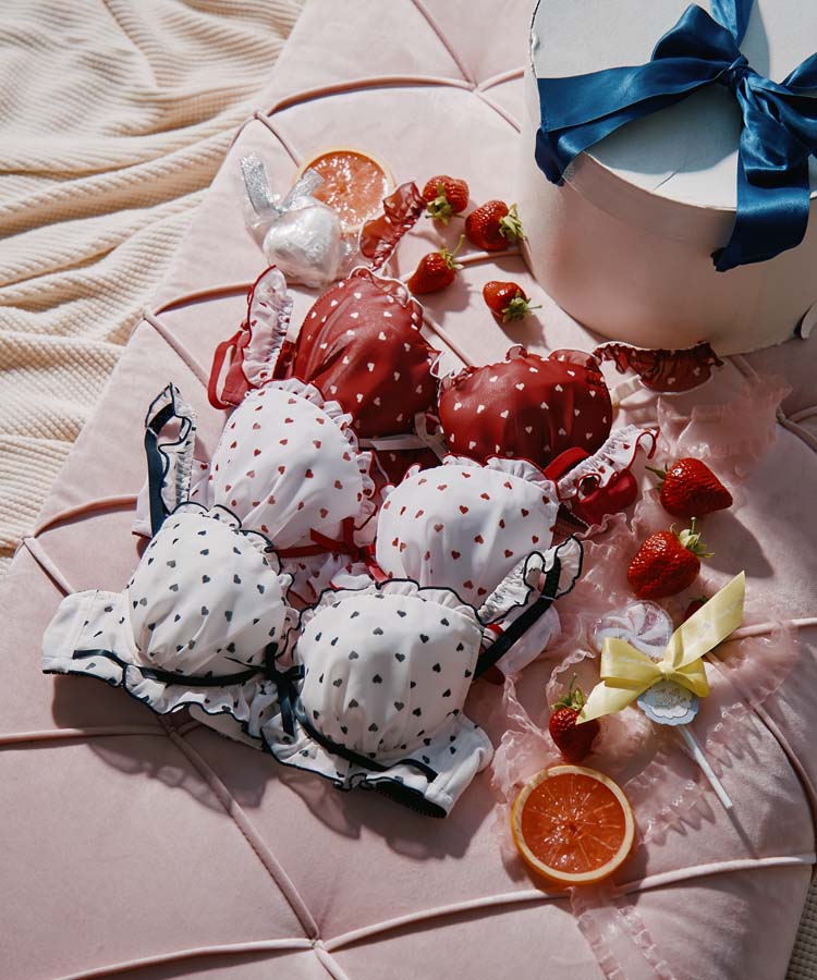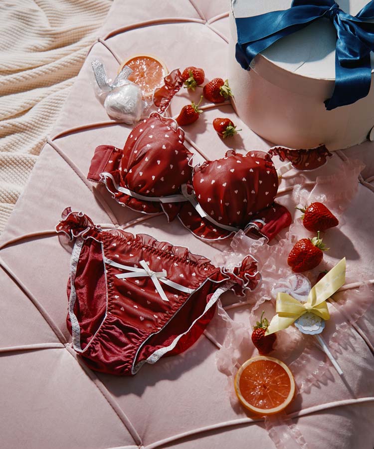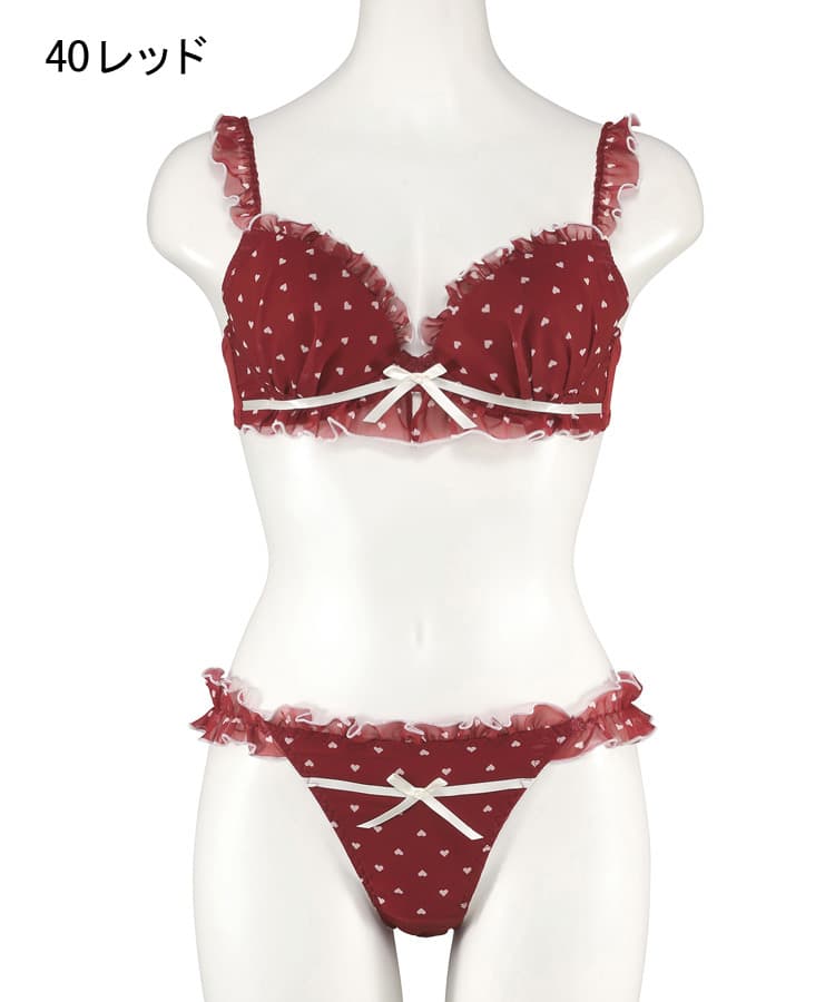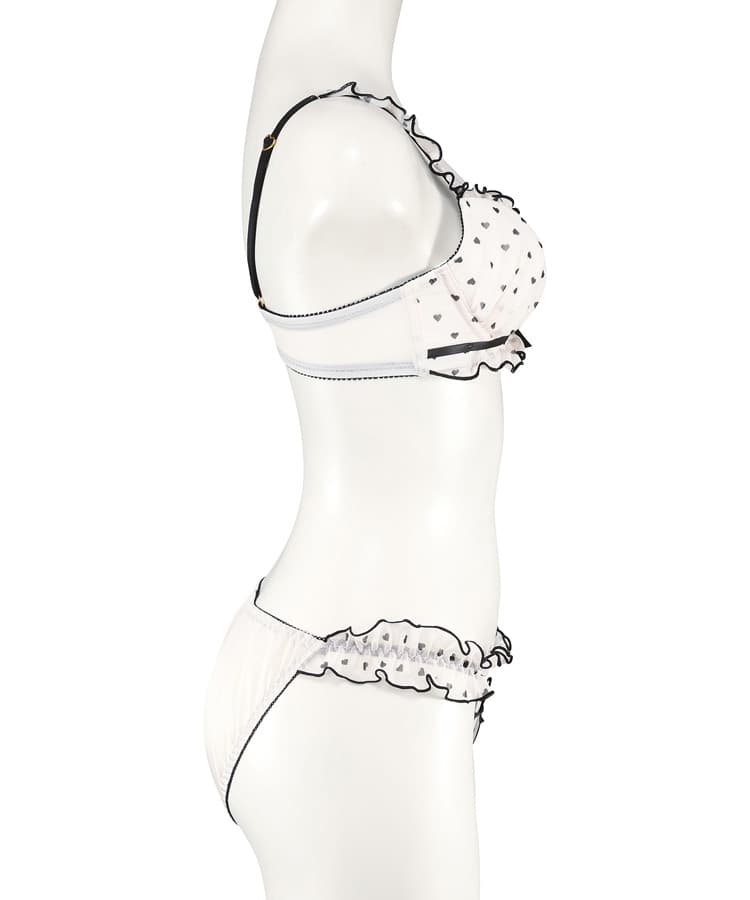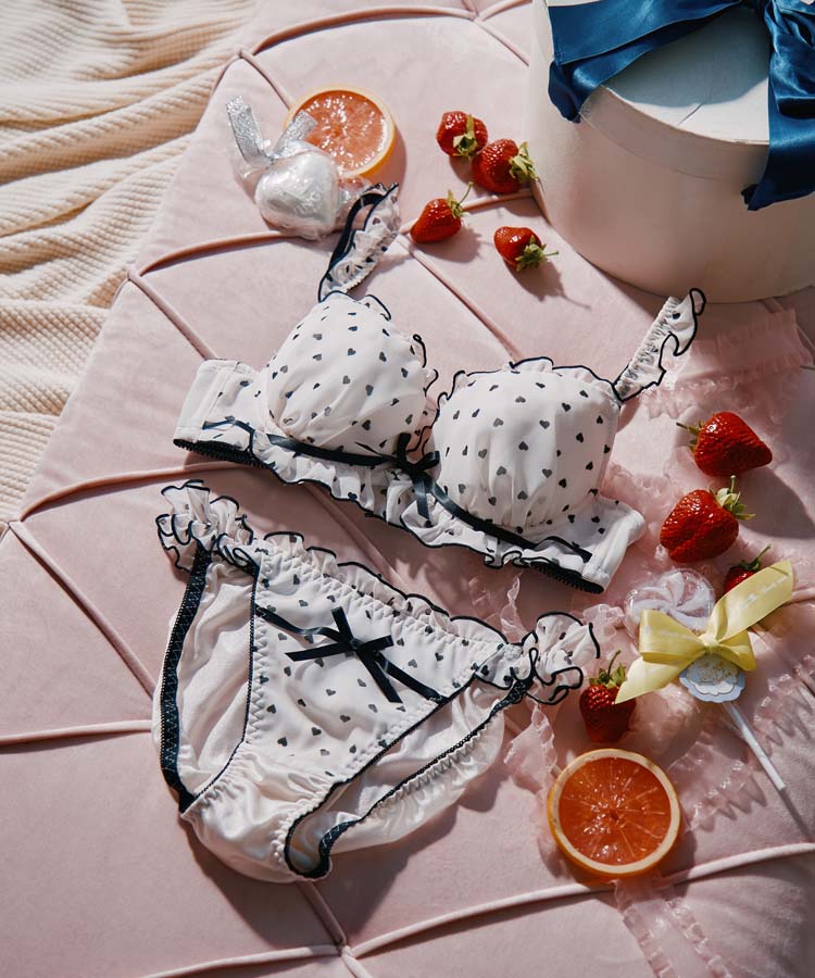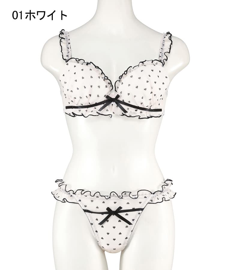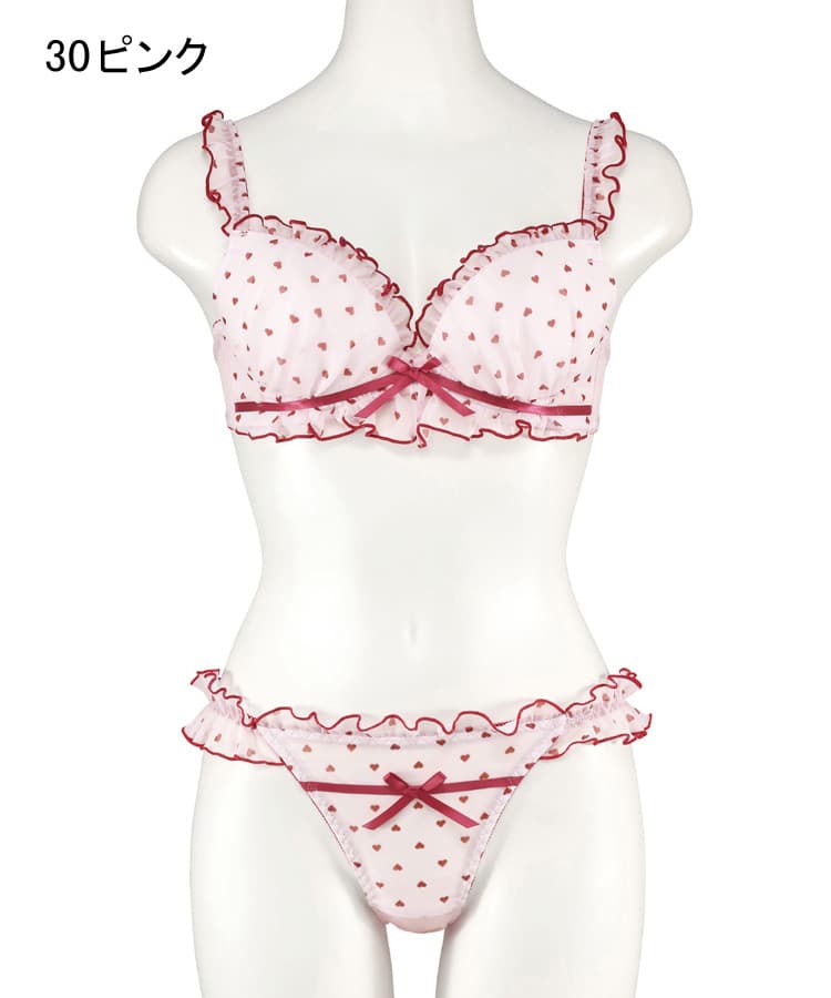 ふんわりシフォンに散りばめられた小さなハート柄がとびきりキュートなブラジャー&ショーツセット。