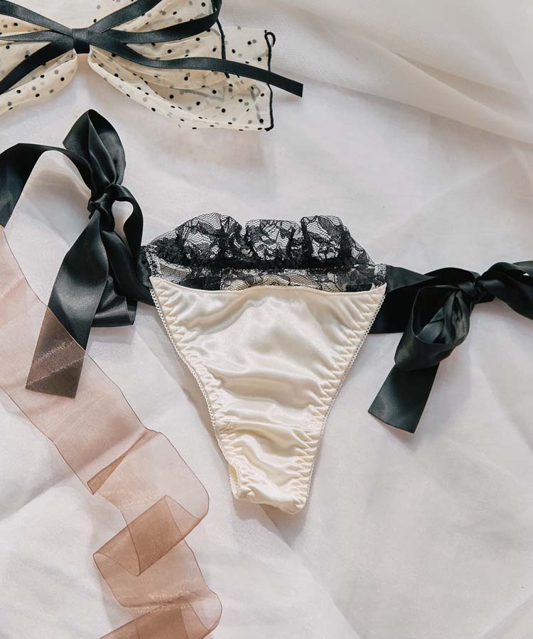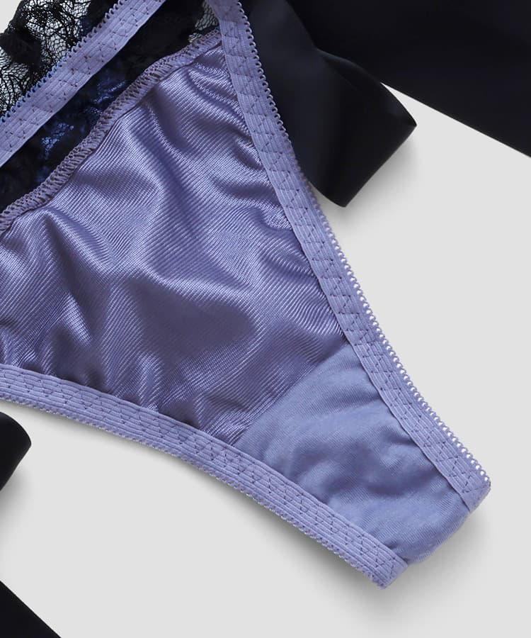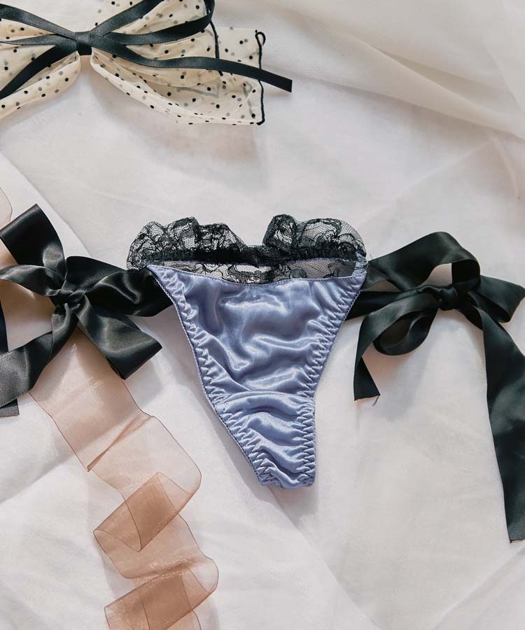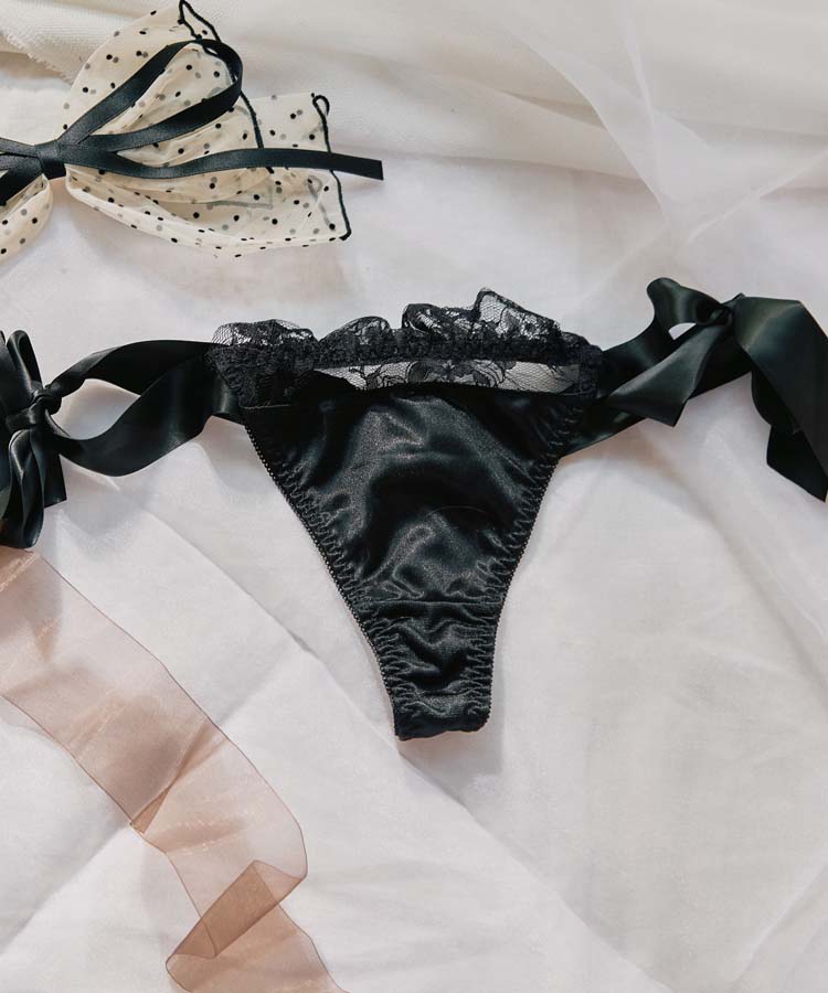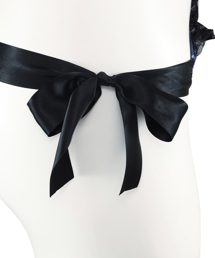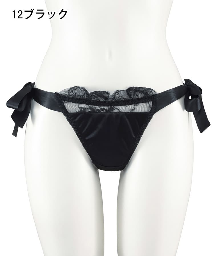 艶やかなサテンと、大きなリボンのデザインが魅力的なロマンティックなTバックショーツ。