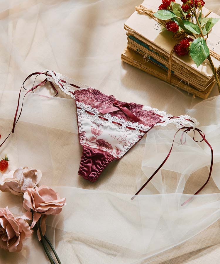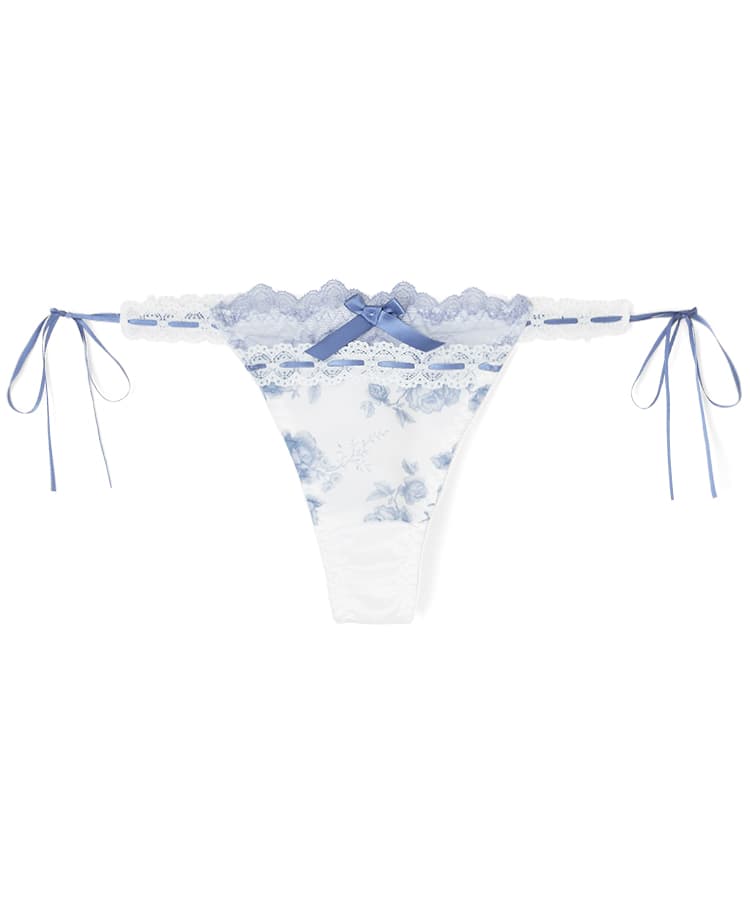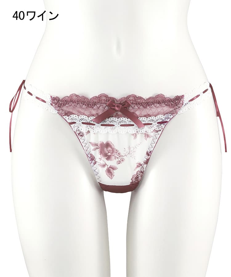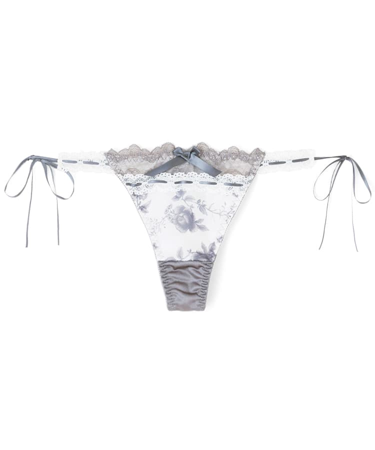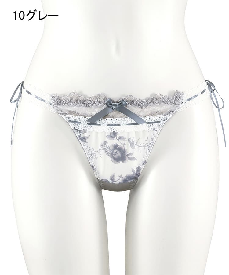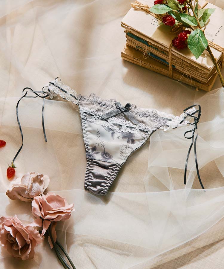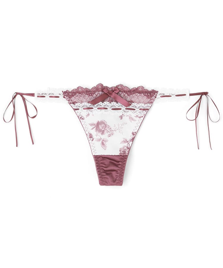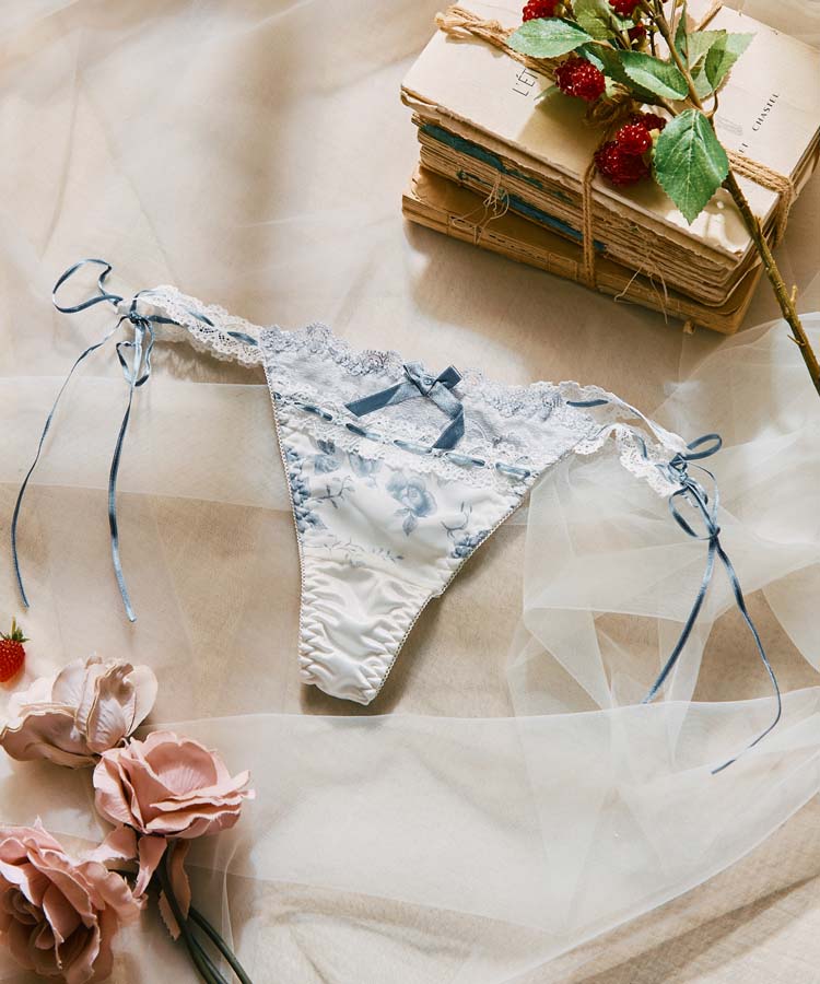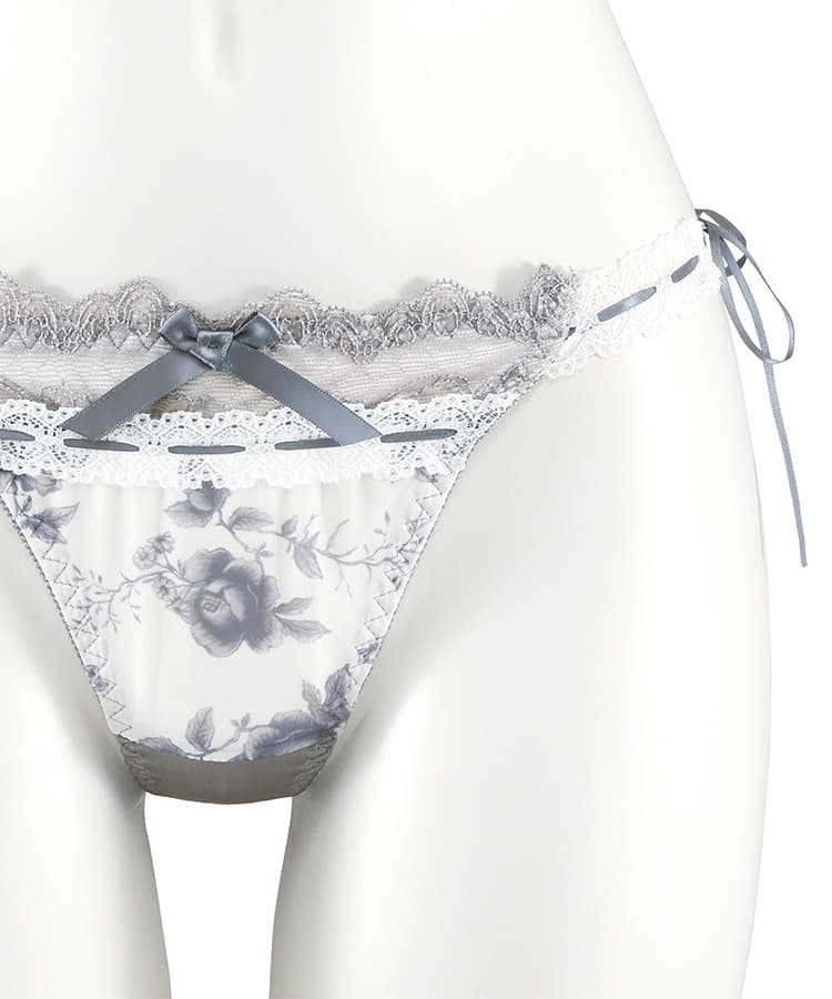繊細なローズ柄プリントと、さりげなく重ねたレースが美しく調和したブラ&ショーツセット。