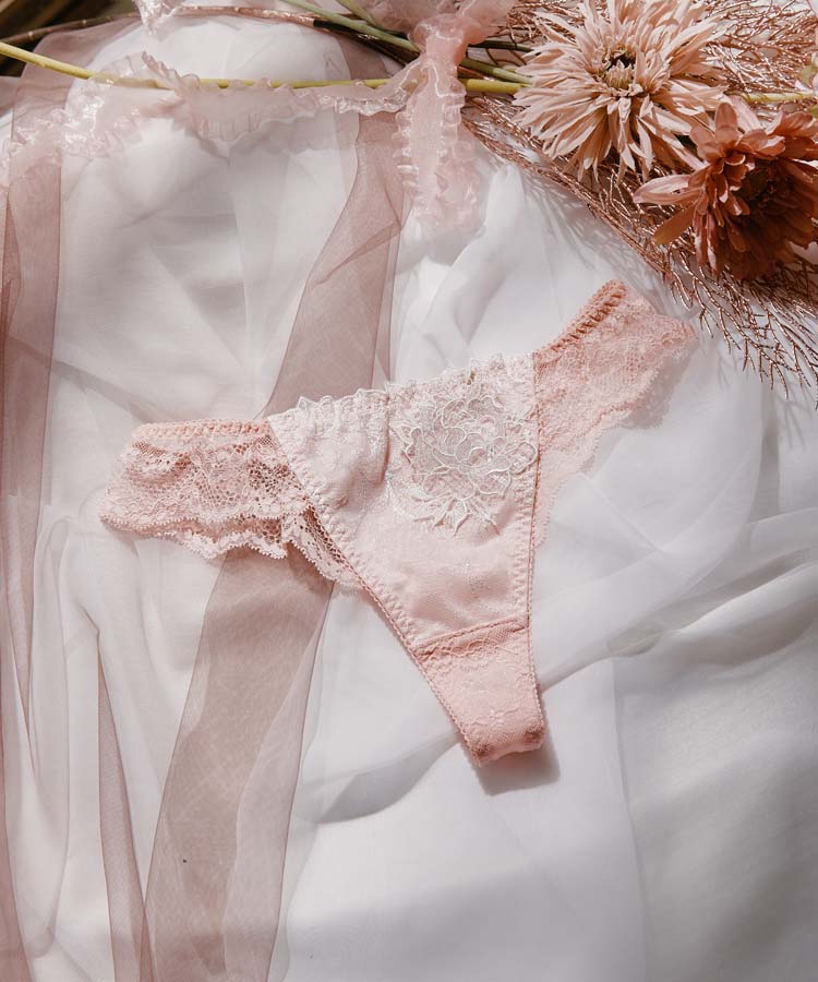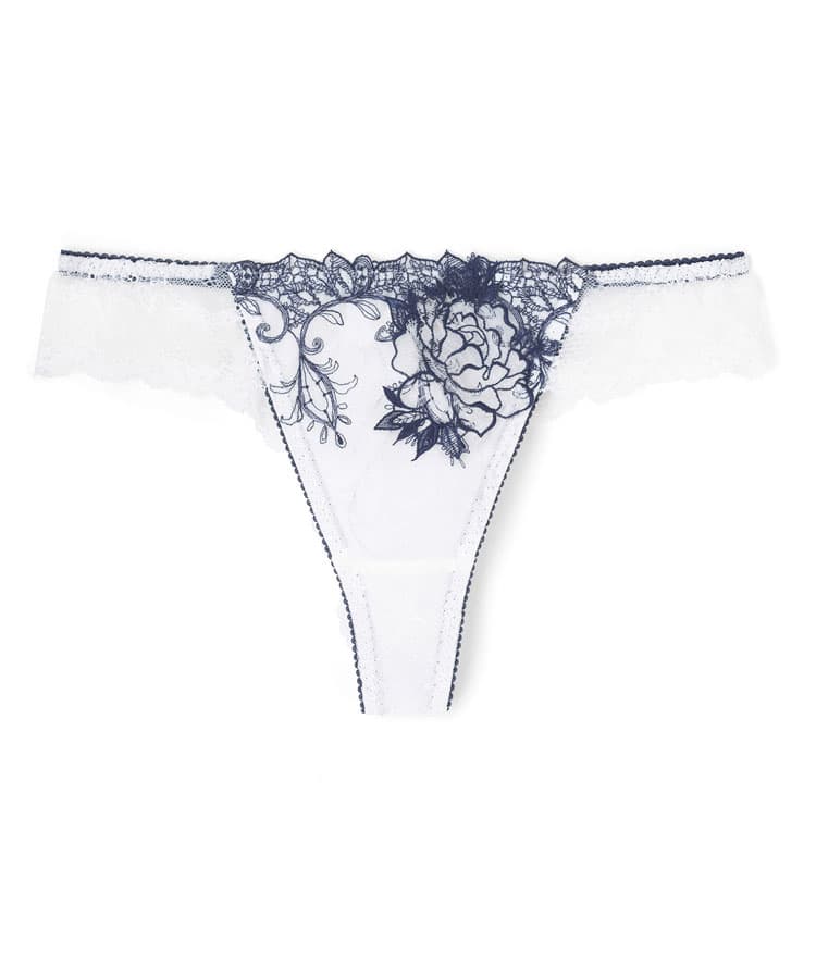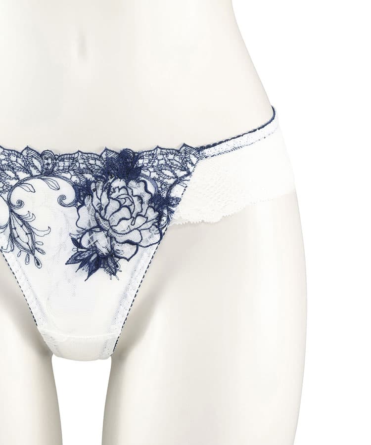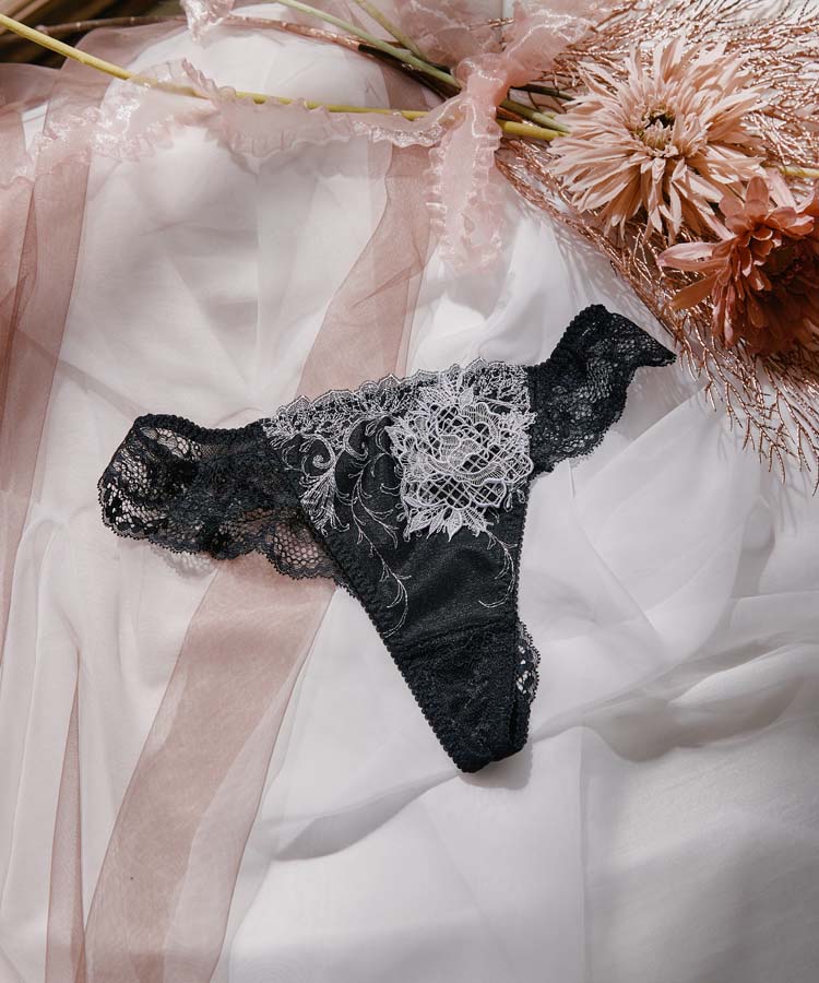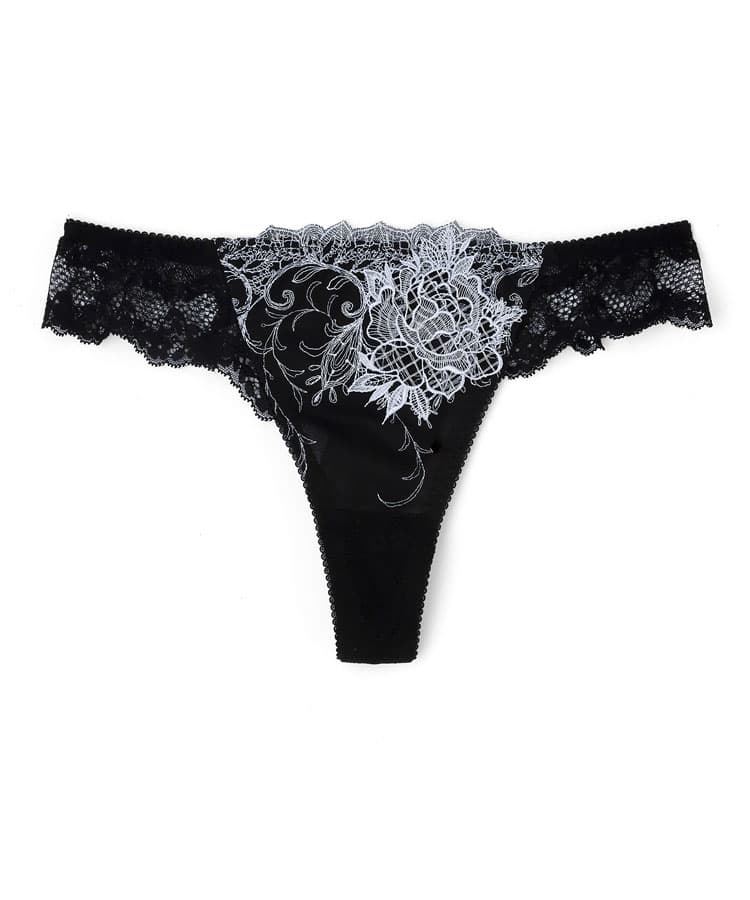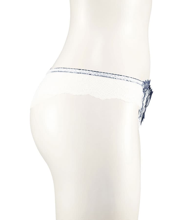 妖艶な孔雀の羽をモチーフにした、ラメラインが繊細に彩るレースを使用したTバックデザインショーツ。