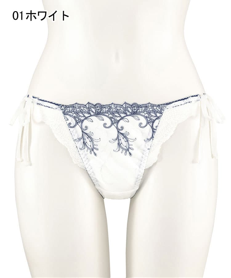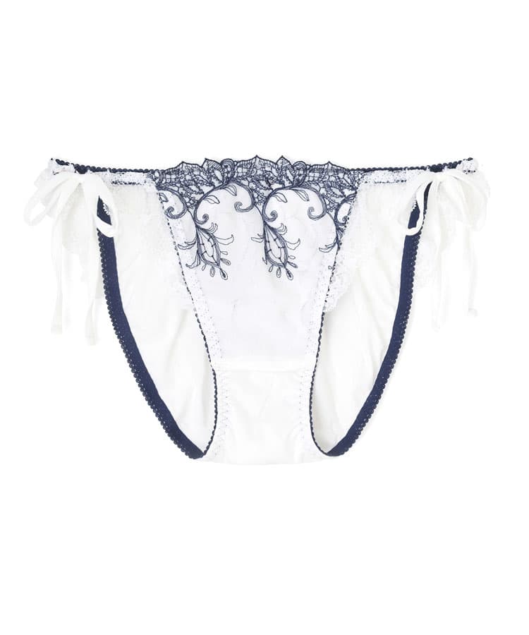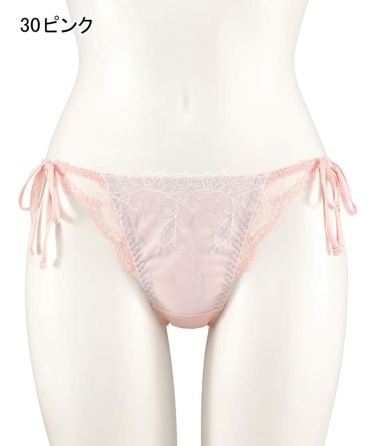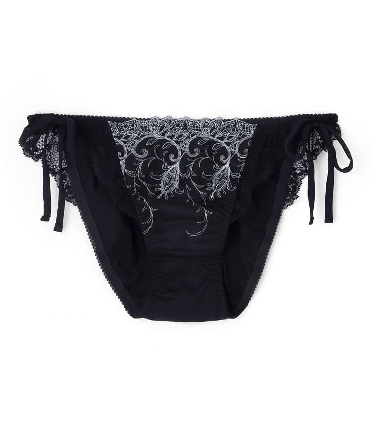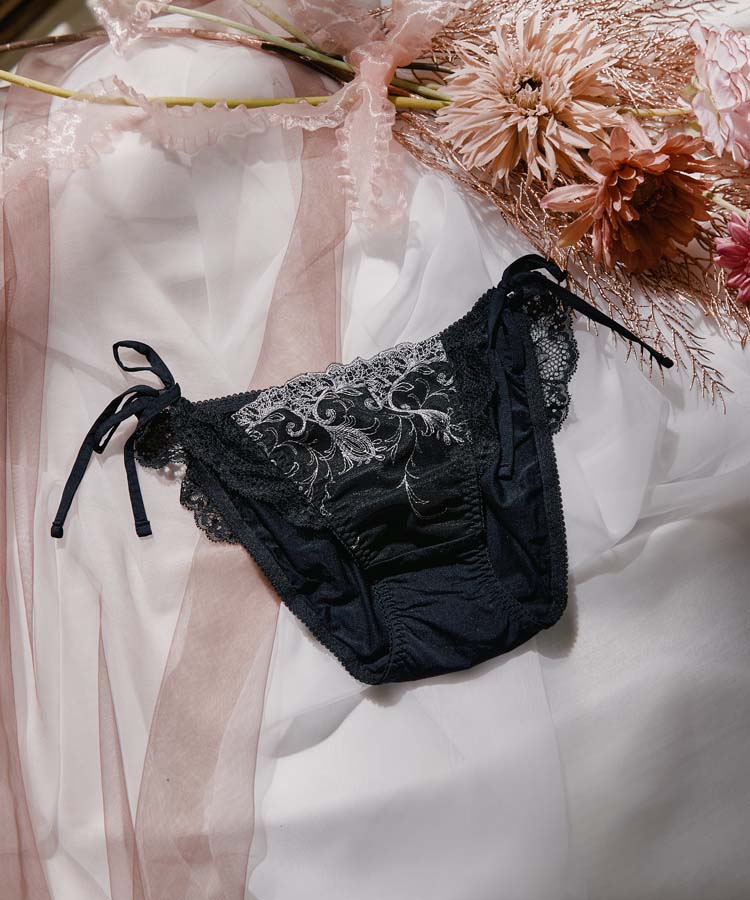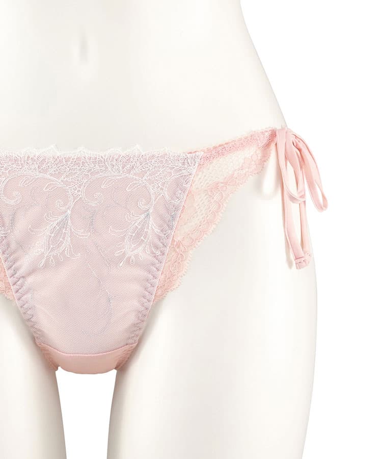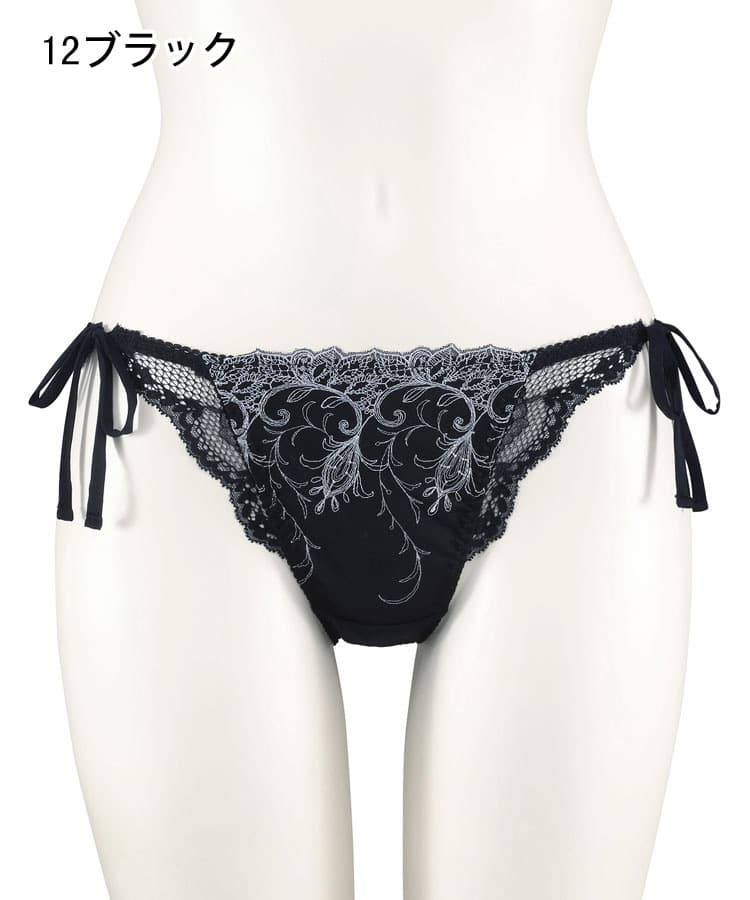 妖艶な孔雀の羽をモチーフにした、ラメラインが繊細に彩るレースを使用したヒモショーツ。