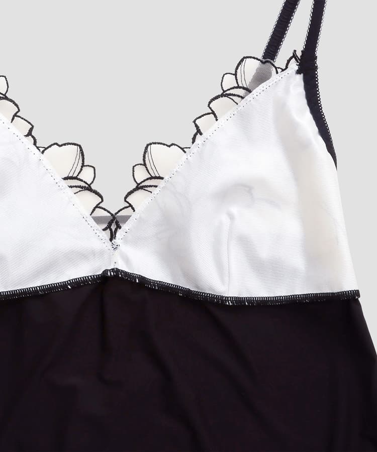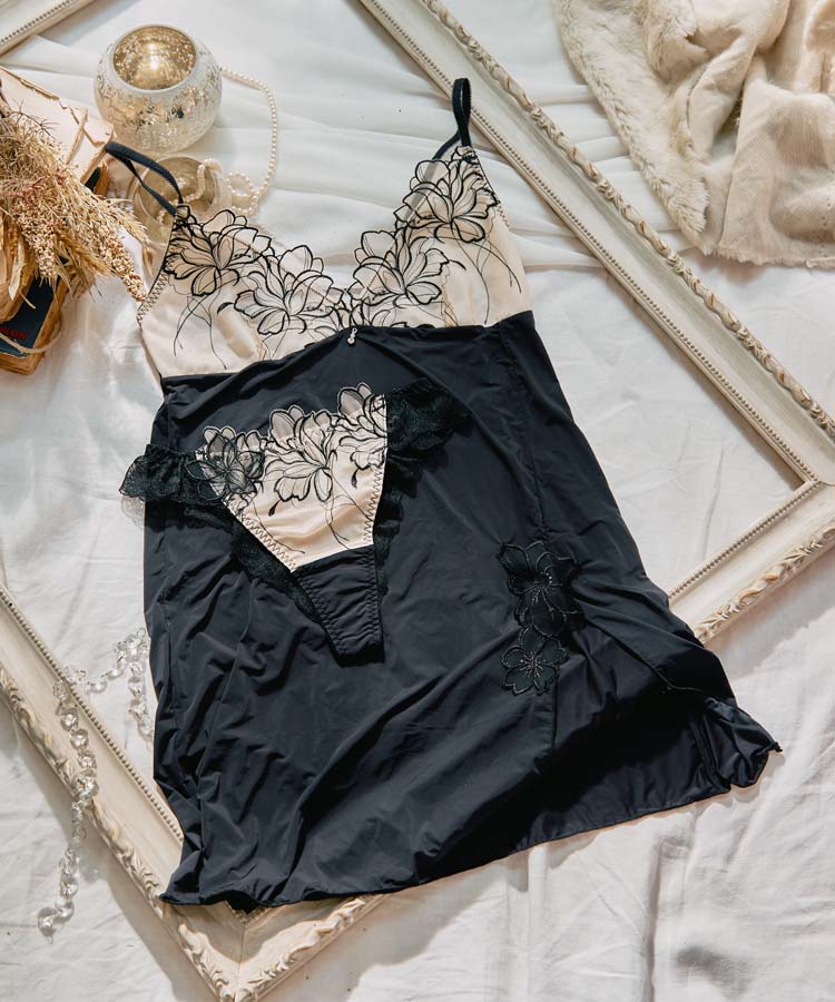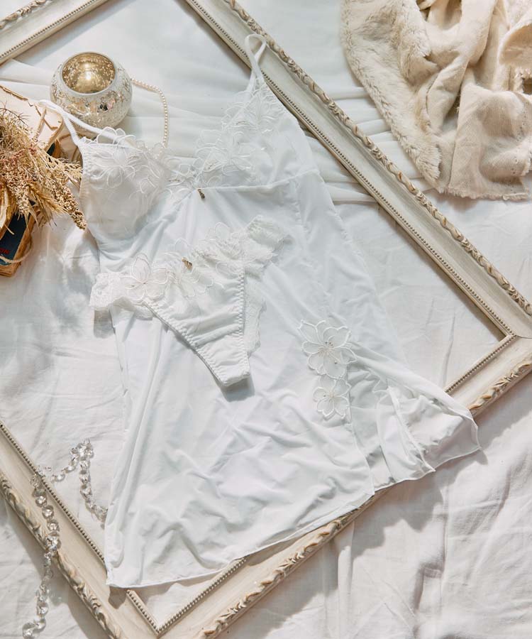 アップリケと、大柄の流れるような花柄レースを組み合わせ、繊細さと華やかさを美しく調和させたデザインに仕上げました。