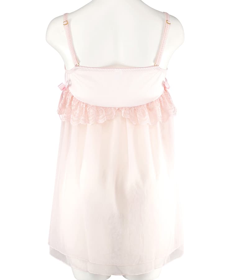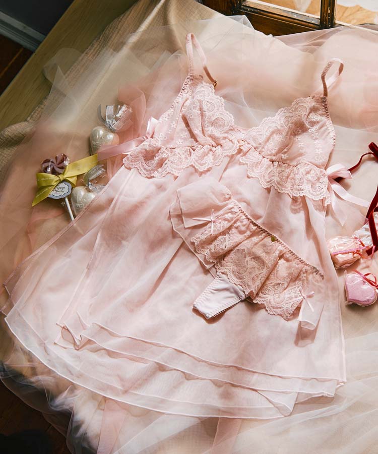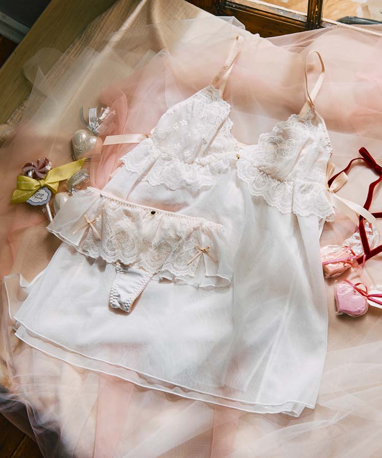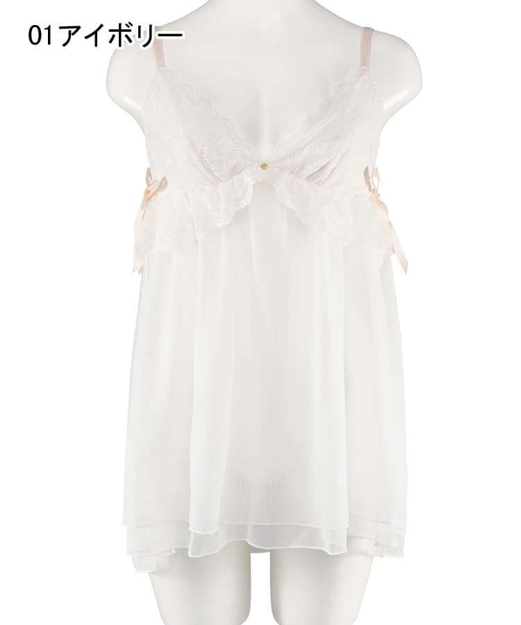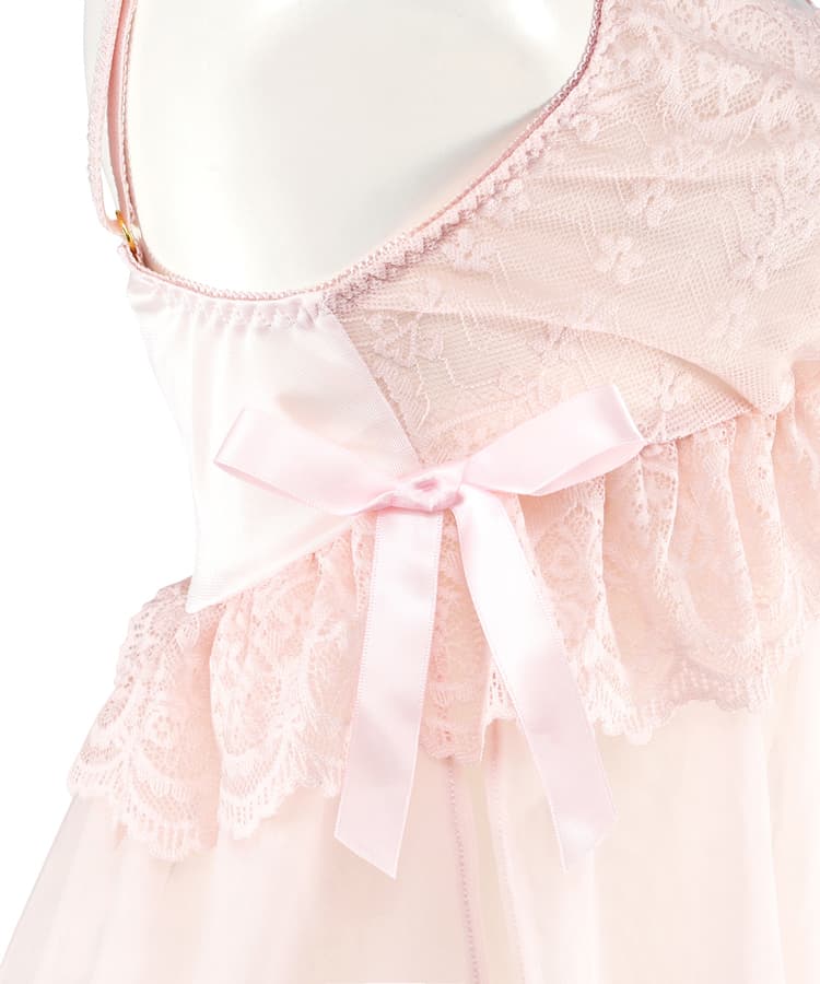 ふんわり透け感のある2枚仕立てのチュール身頃、バスト部分はブラと同じデザイン。