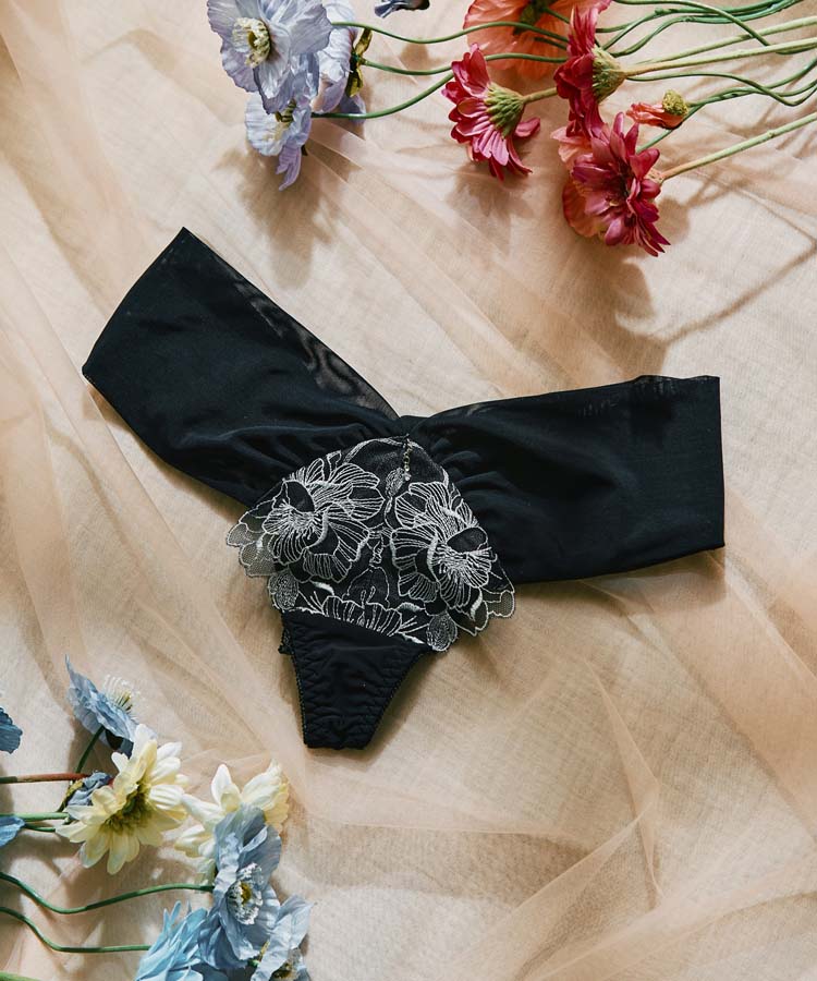 大きな花柄のレースが大人の色気を漂わせ、可憐さの中にも凛とした美しさを感じさせるデザイン。