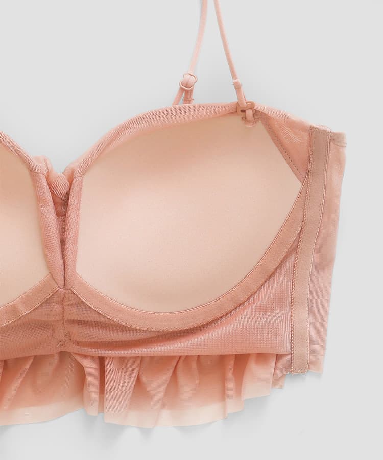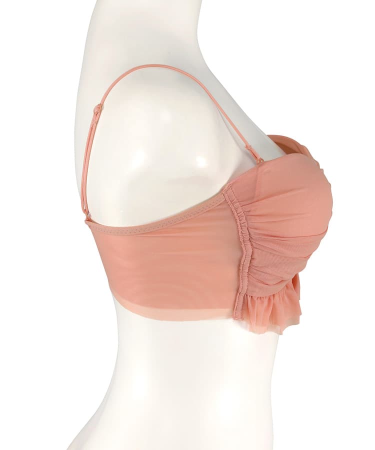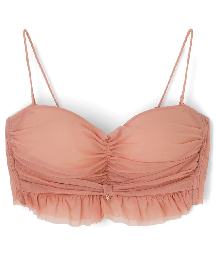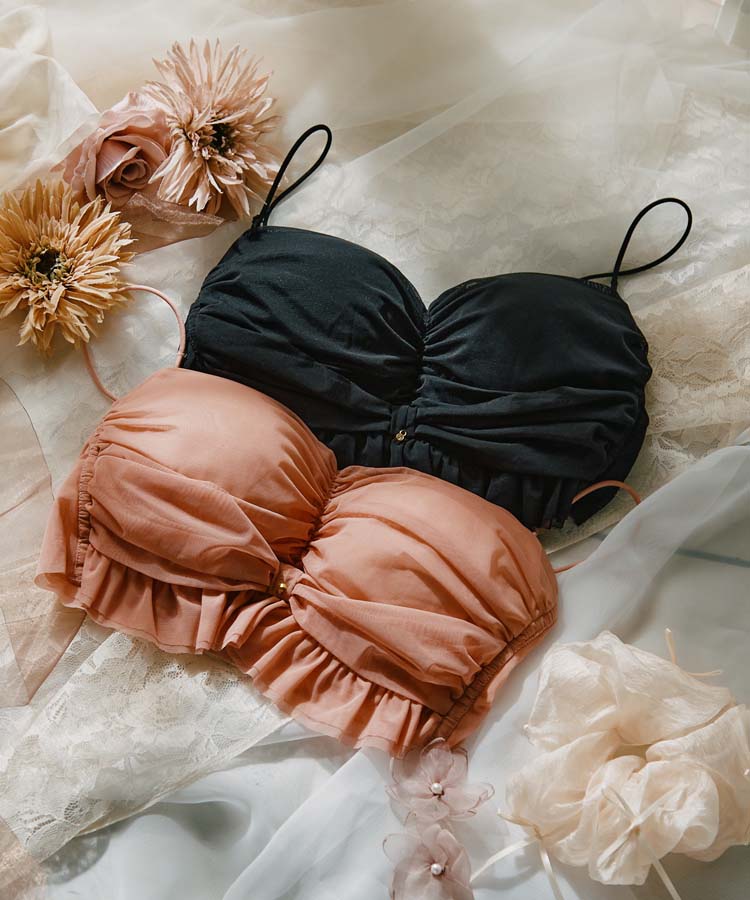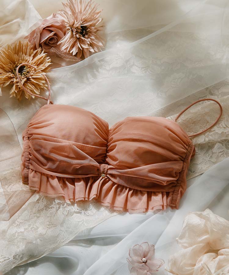 透け感のある素材をカップにたっぷり使用し、ふんわりと立体感のある表情が、バストを華やかに彩ります。
