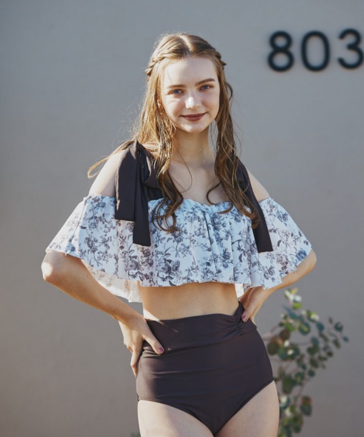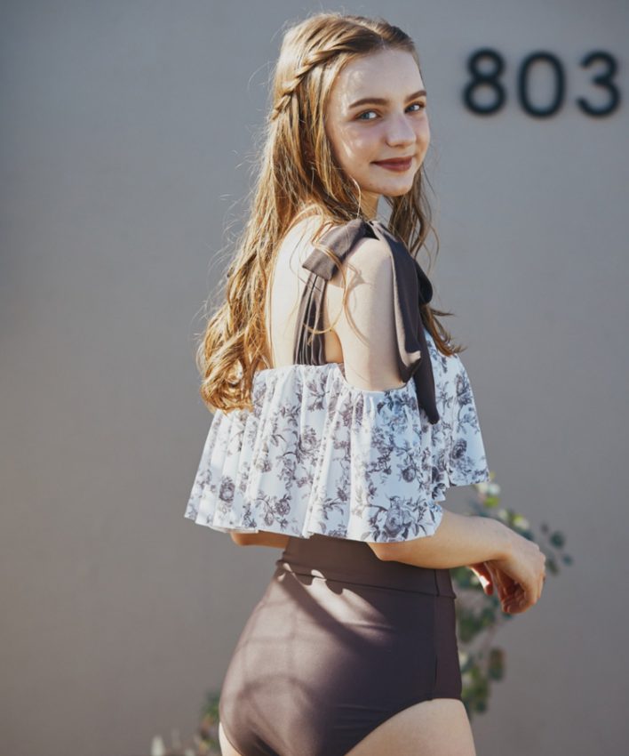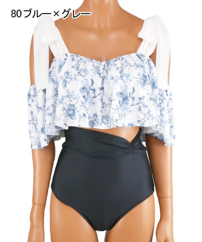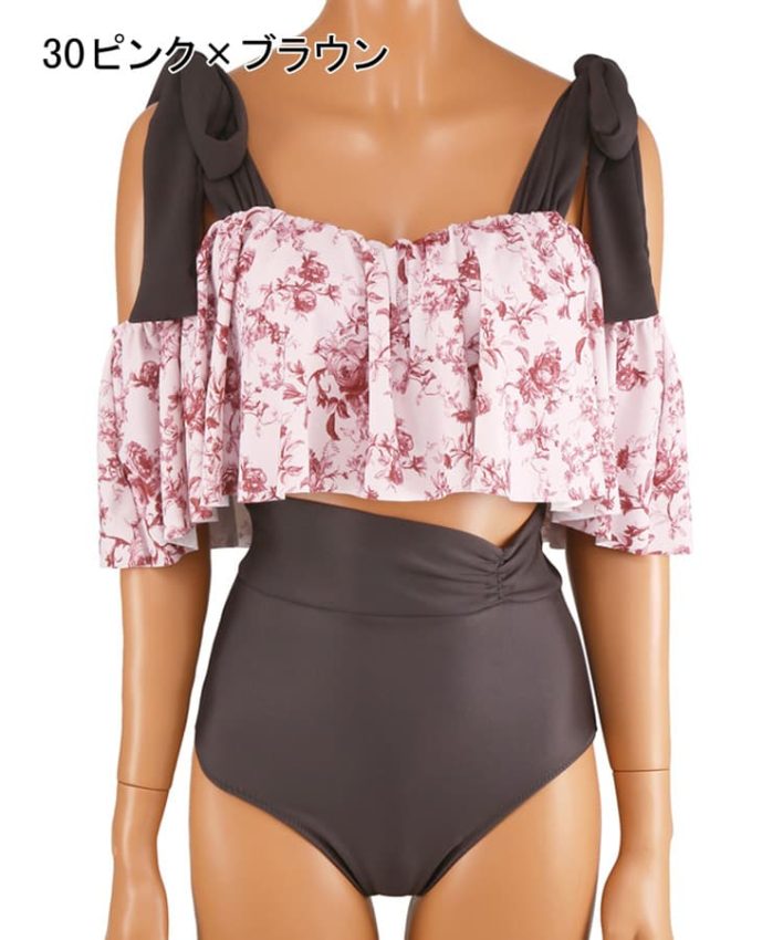壁紙風の繊細なフラワープリントのオフショルダーワイヤービキニ。