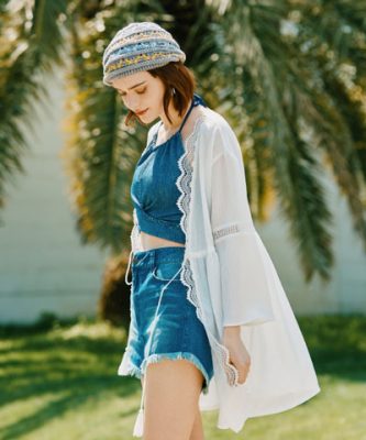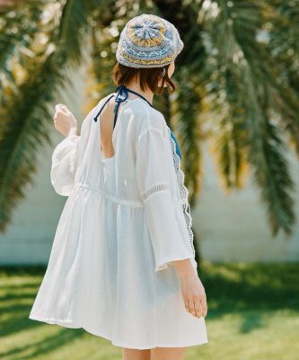 〇身頃や袖部分にレースをあしらった、甘過ぎず、様々なテイストの水着に合わせやすい羽織りです。