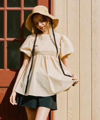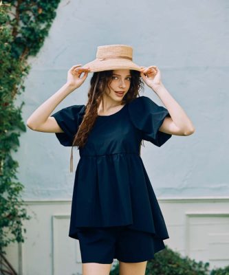 セットのショートパンツは太ももをすっきり見せてくれる上品なフレア。