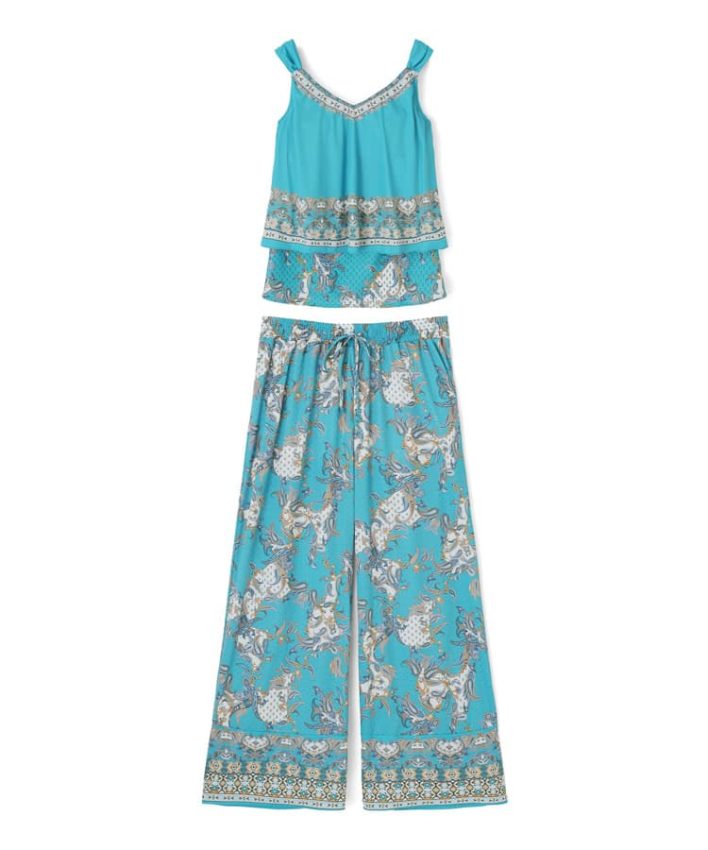 リゾートに映えるカラーリングとパネル調のエスニック柄のタンキニとロングパンツのセットアップ。
