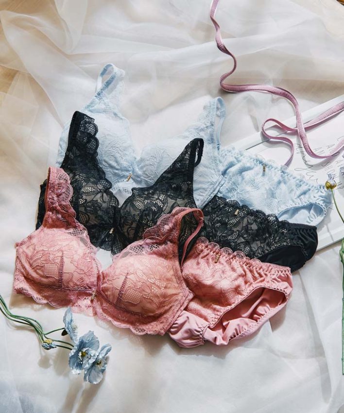 大人っぽい花柄レースが印象的な、ノンワイヤーブラ&ショーツのセット。
